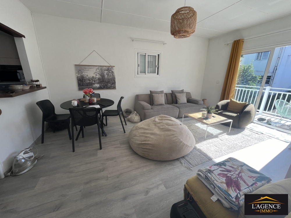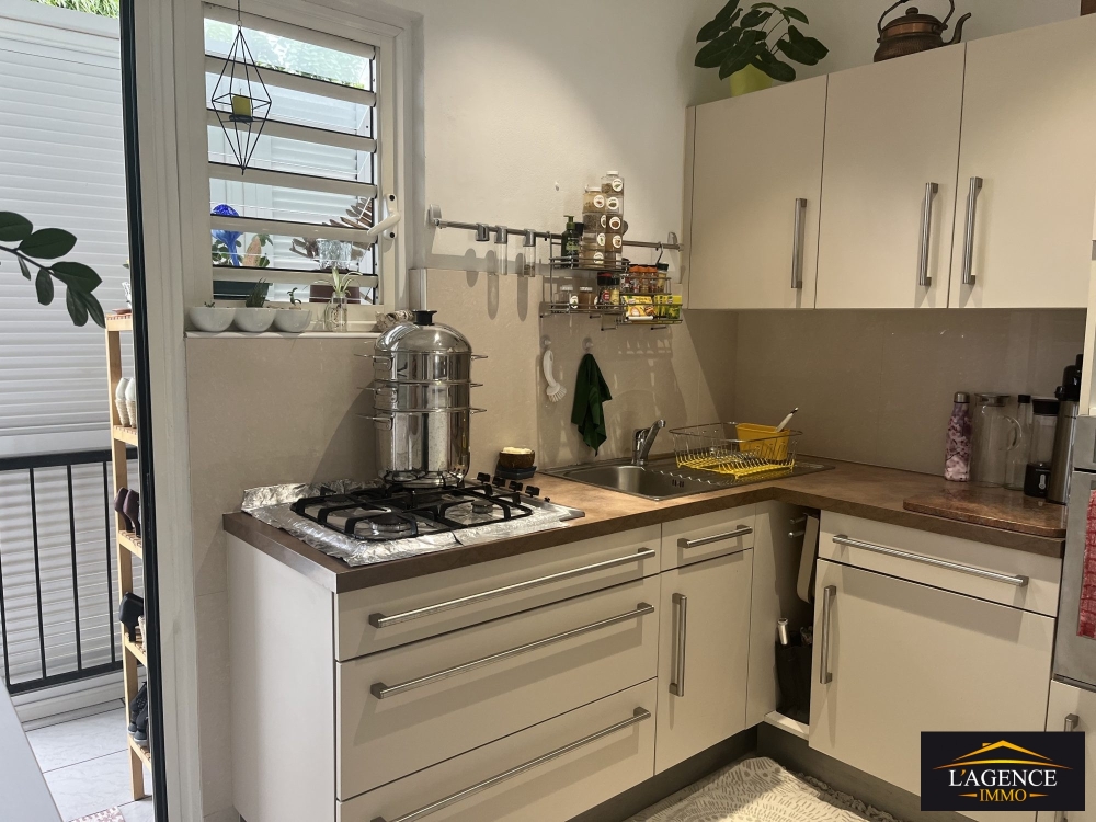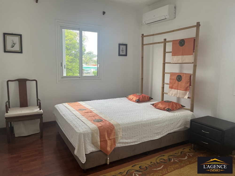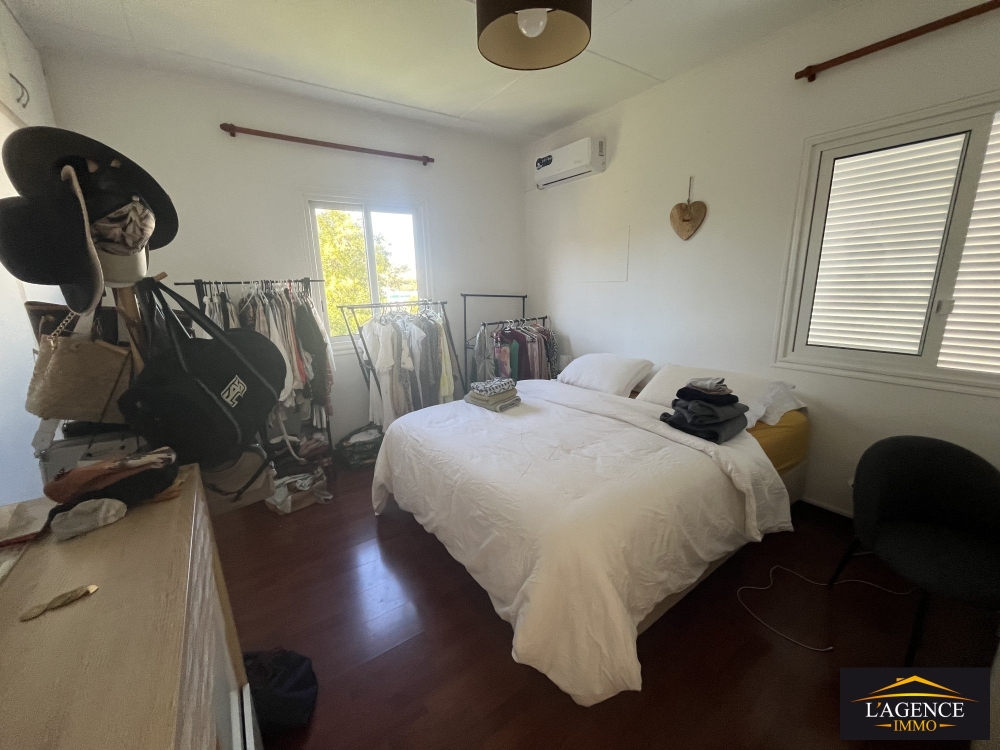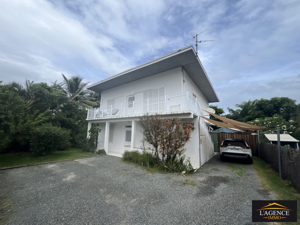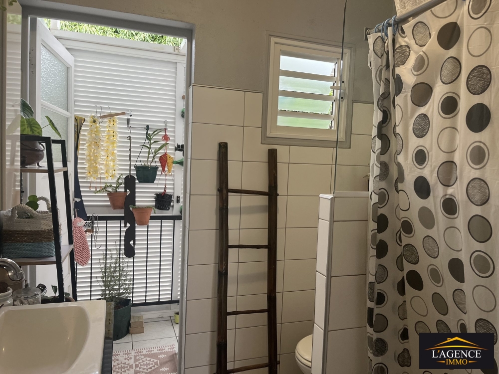 Haut de villa (appartement) de type F3 comprend un séjour lumineux avec coin cuisine ouverte, une buanderie, un dégagement menant. à deux grandes chambres (14.5 m² et 15.4 m²) équipées de placards , persiennes et climatisation, ainsi qu'une salle d'eau avec WC. Le logement dispose également d'un balcon, d'une place de stationnement abritée par des toiles tendues pour un véhicule et un deux-roues, et d'un accès à un cagibi sous l'escalier extérieur.