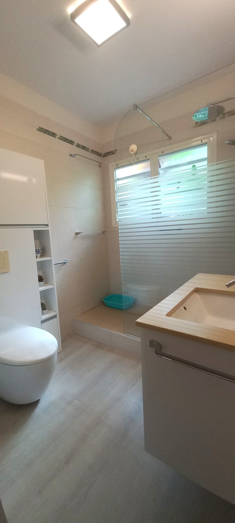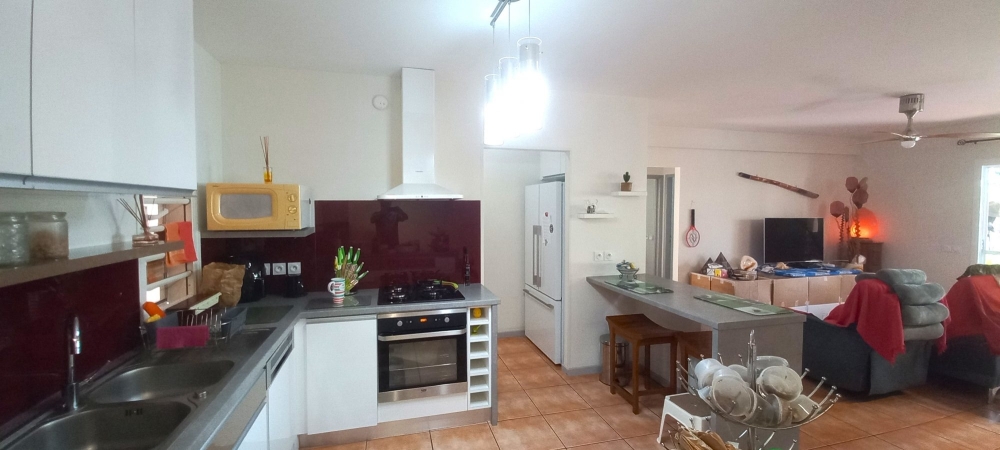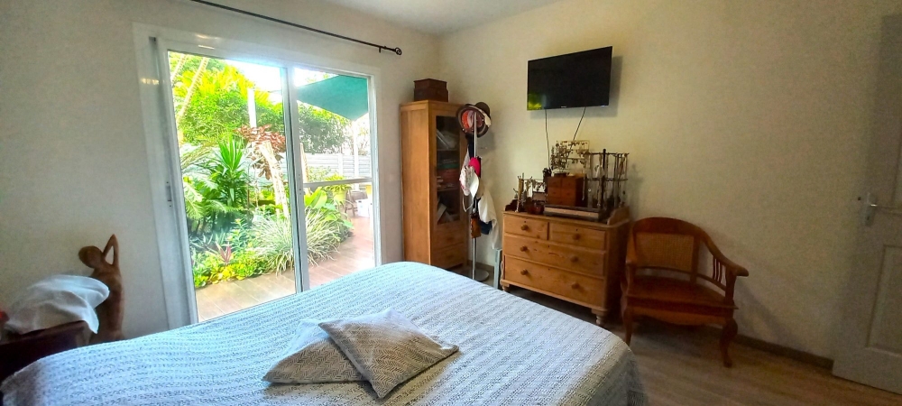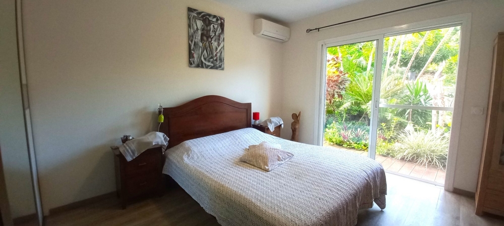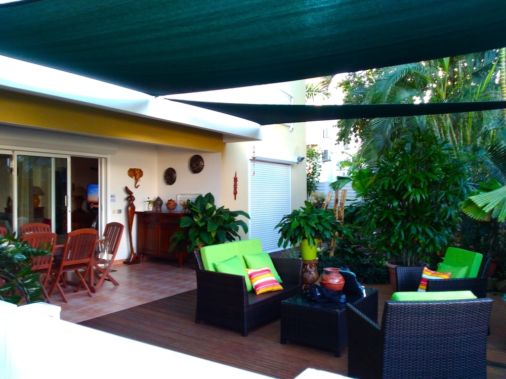 En fond d'impasse, dans un écrin de verdure, au calme absolu, Résidence Le Petit Trianon en parfait état d'entretien, Appartement en Rez de jardin comprenant : cuisine équipée ouverte sur séjour de 40m², deux chambres climatisées avec placards, salle d'eau , buanderie de 12m² et cellier accessible de l 'intérieur. Grand jardin arboré, piscinable. Deux places de parking sécurisées situées devant l'appartement avec accès direct à la terrasse.