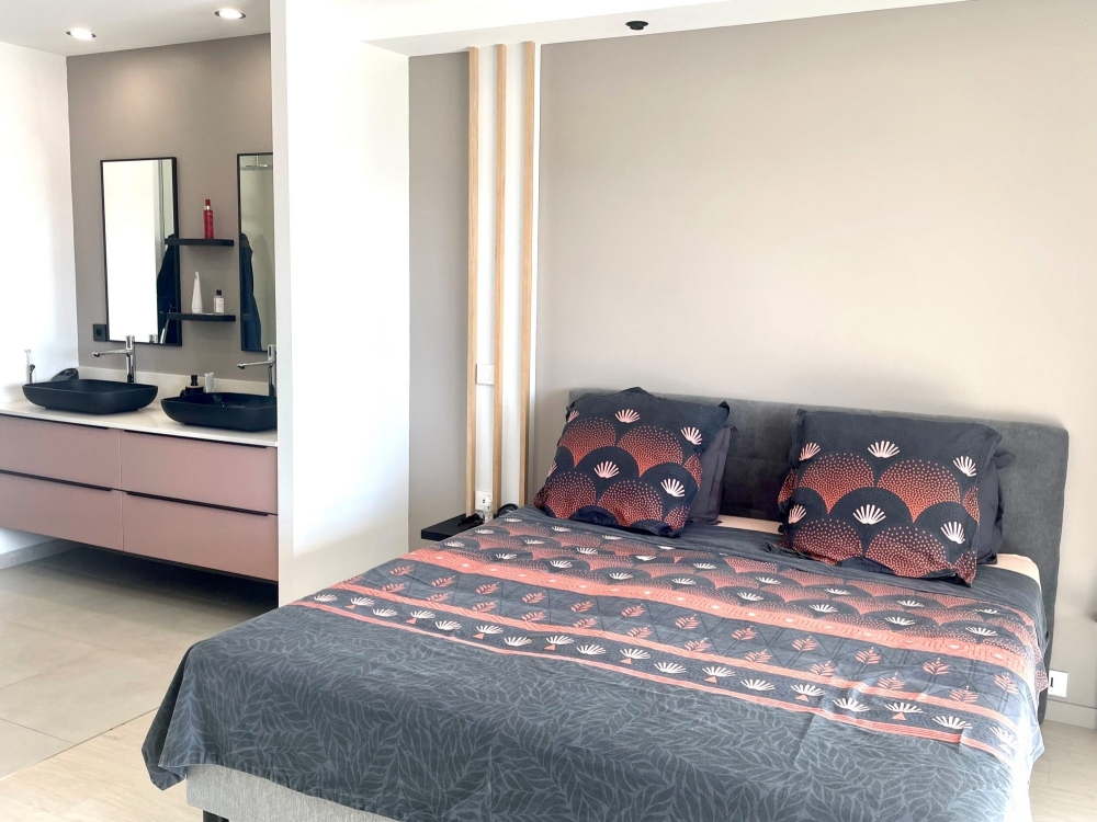 Il se compose d'un grand salon avec coin salle à manger tout en baies vitrées avec une magnifique vue mer, d'une cuisine équipée semi ouverte et d'une arrière cuisine/buanderie, d'un dégagement menant à deux chambres et une salle de bain, d'une grande suite parentale comprenant un dressing ainsi qu'une salle d'eau.