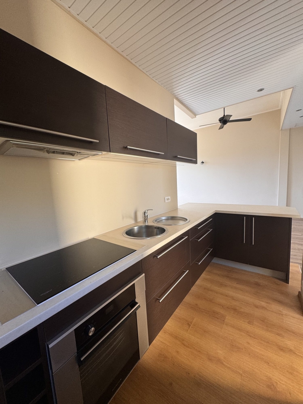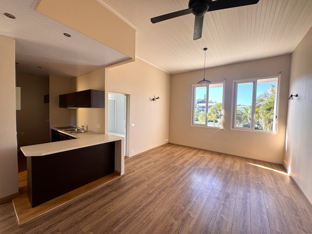 Appartement au 1er et dernier étage, avec accès indépendant de plain pied, comprenant : cuisine américaine , équipée et aménagée ouverte sur séjour avec grande hauteur sous plafond, chambre climatisée avec placards, mezzanine et salle d'eau,