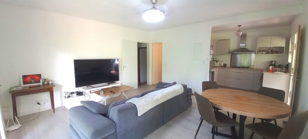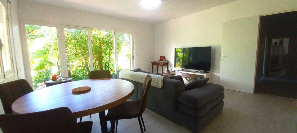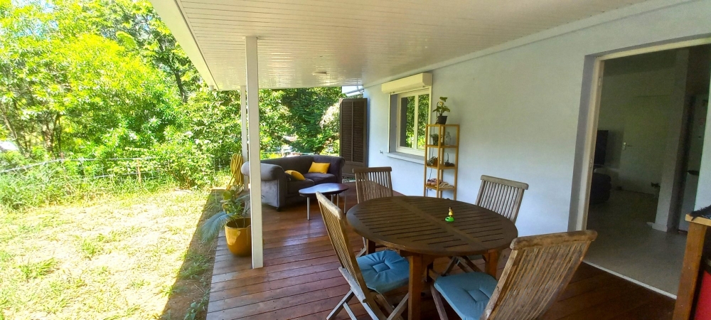 Dans un écrin de verdure, au calme, sur 9 ares de terrain , Bas de villa comprenant : cuisine équipée et aménagée ouverte sur séjour, 2 grandes chambres avec placards et dressing, salle d'eau. Terrasse couverte. Piscinable