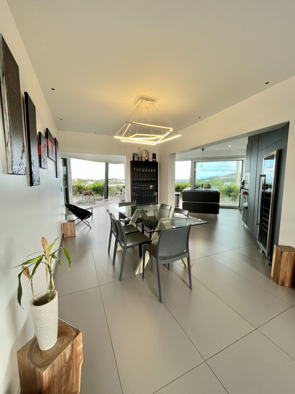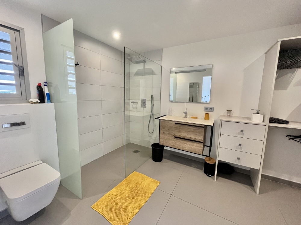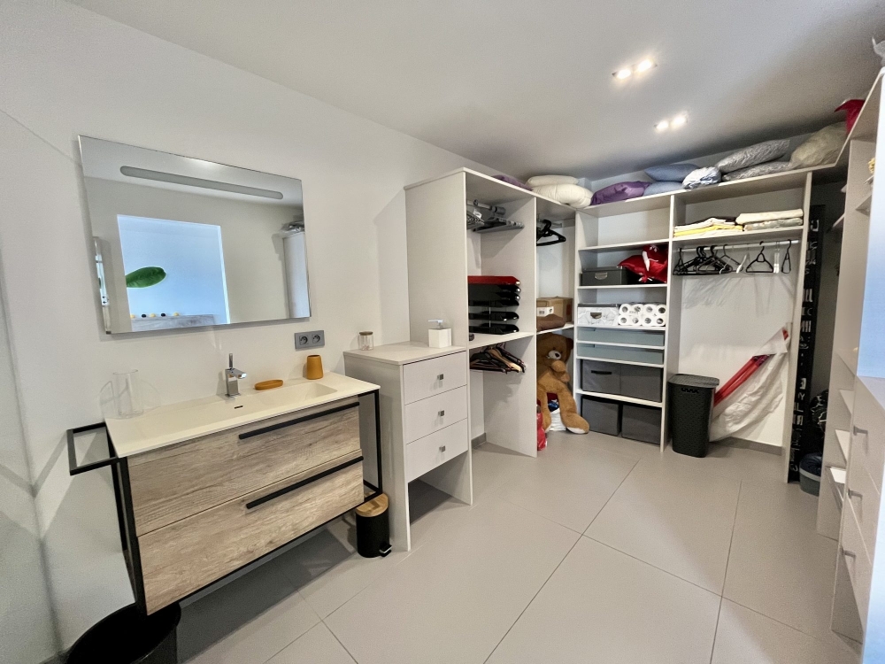 L'intérieur du bas de villa se compose d'un hall d'entrée donnant sur une salle à manger et une cuisine entièrement équipée et moderne, équipée de baies vitrées faites sur mesure et pouvant s'ouvrir entièrement sur la terrasse avec une vue dégagée sur la mer. Une deuxième aile comprend deux suites parentales climatisées avec dressing, WC et salle d'eau pour l'une, salle de bain pour la seconde, avec baies vitrées et volets roulants électriques, permettant une entrée indépendante, donnant sur la piscine. Un bureau/salle TV avec entrée indépendante. Une buanderie et un WC extérieur indépendant.