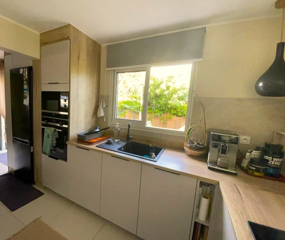 Cuisiné équipée ouverte sur séjour, suite parentale climatisée avec placards et salle d'eau, deux chambres climatisées avec placards, salle d'eau, wc.