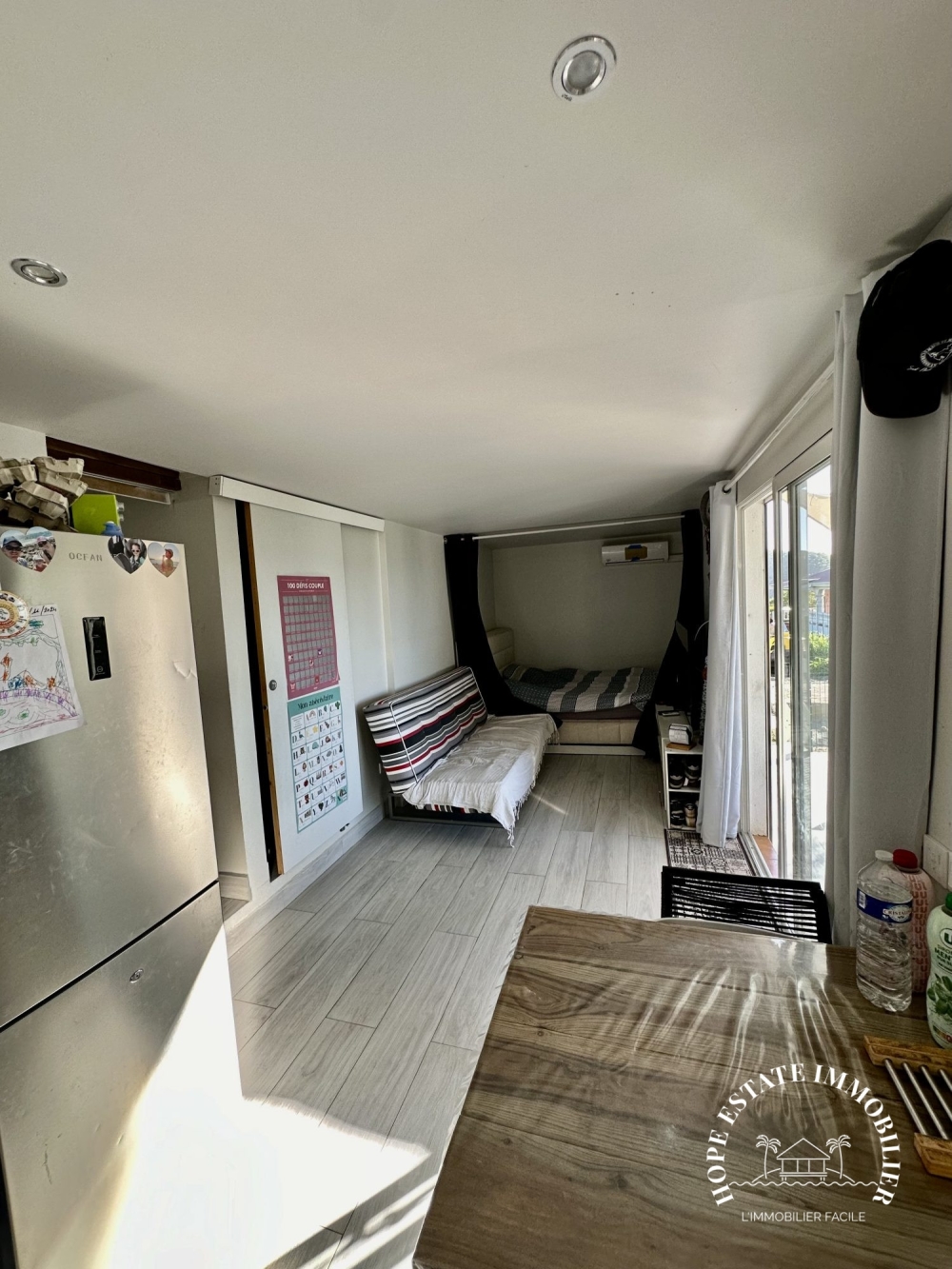 Le T2 se compose d'une pièce de vie/cuisine lumineuse d'environ 20 m², d'une chambre et d'une salle d'eau. Une citerne est également présente pour assurer une réserve d'eau supplémentaire.