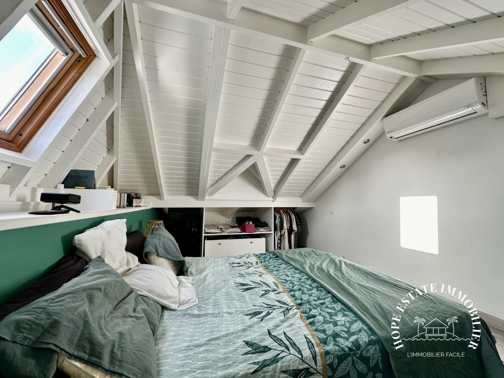 À l'étage, une chambre cosy avec son espace dressing complète ce bien.