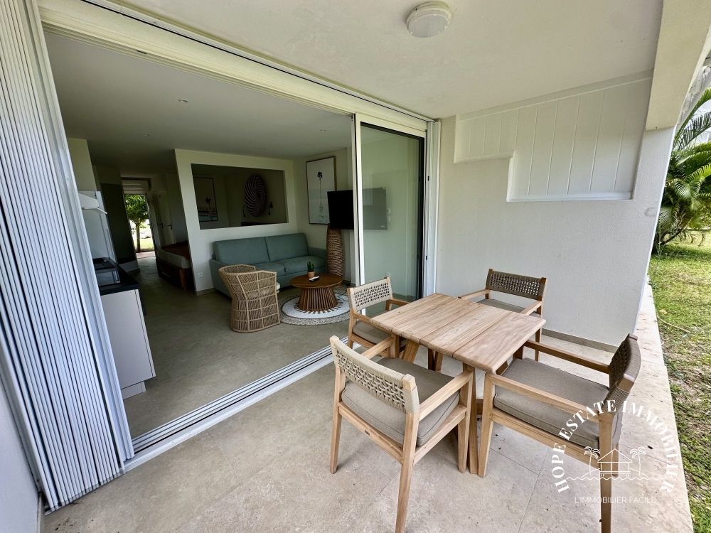 Une agréable terrasse couverte de 10,29 m², idéale pour profiter de la vue sur les jardins tropicaux – et sur la mer pour les appartements à l'étage.