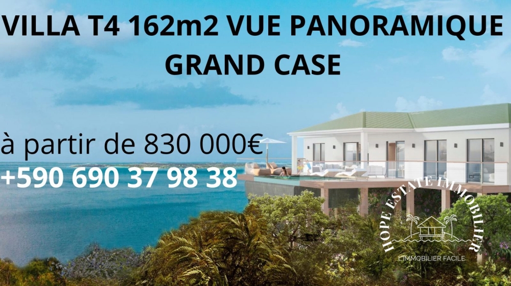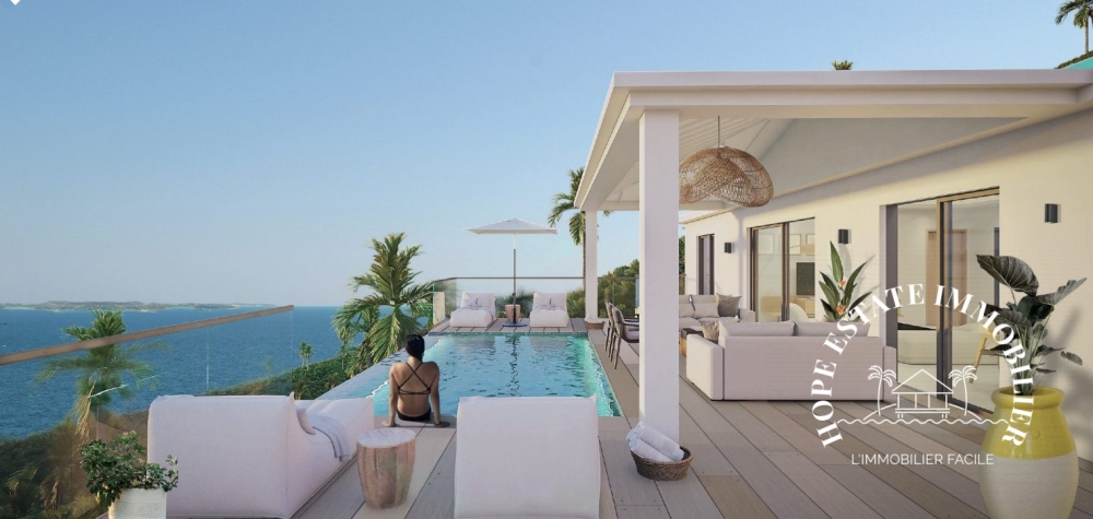 ? Villas T4 avec vue imprenable sur la baie de GRAND CASE – 162 m² habitables, avec 30 m² de terrasse couverte et 36 m² de deck avec piscine, un espace extérieur généreux pour profiter pleinement du climat tropical.