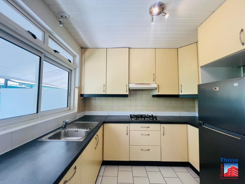 La maison est louée avec une petite terrasse et un stationnement extérieur pour une voiture.