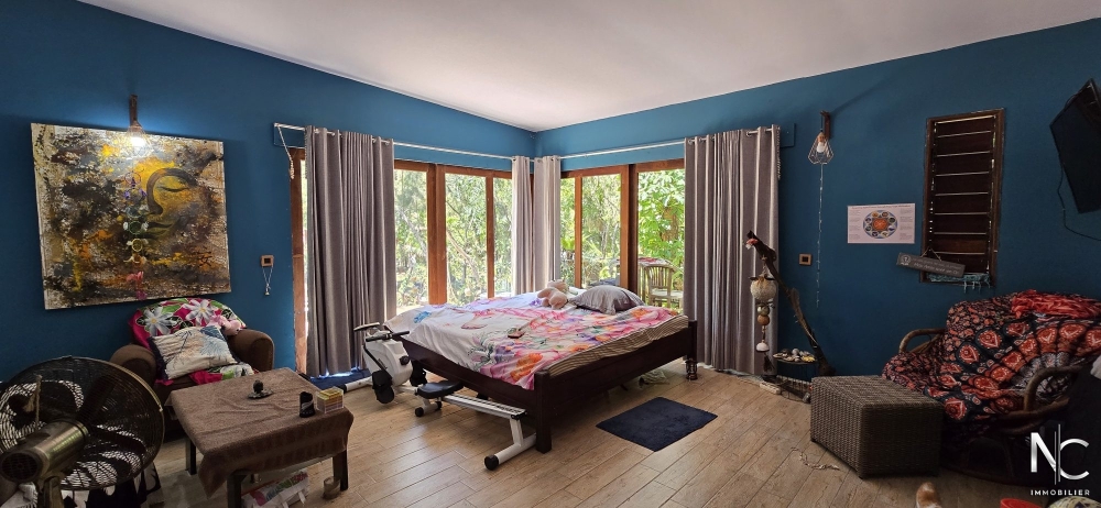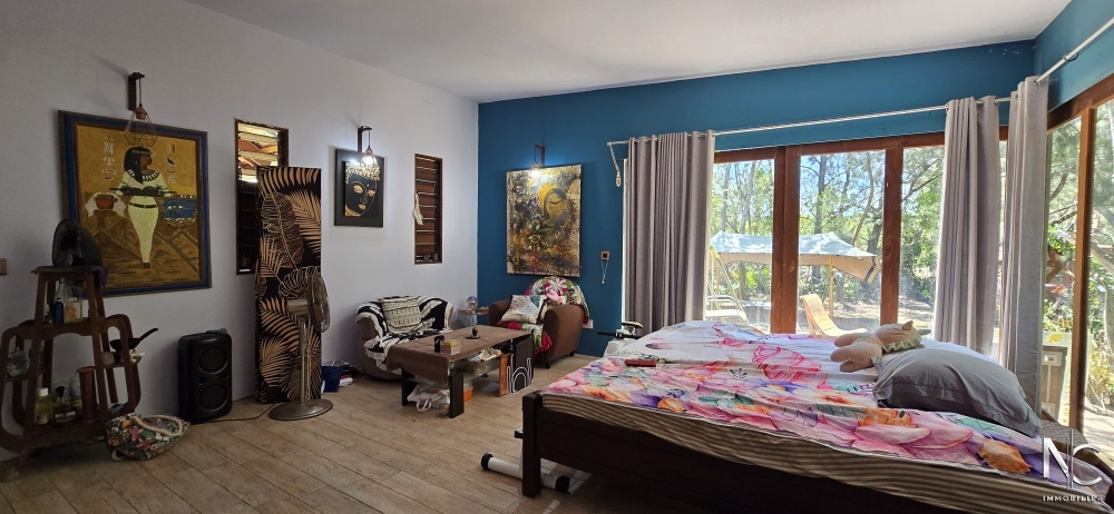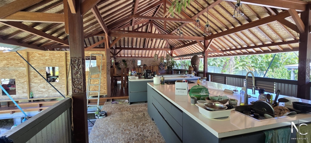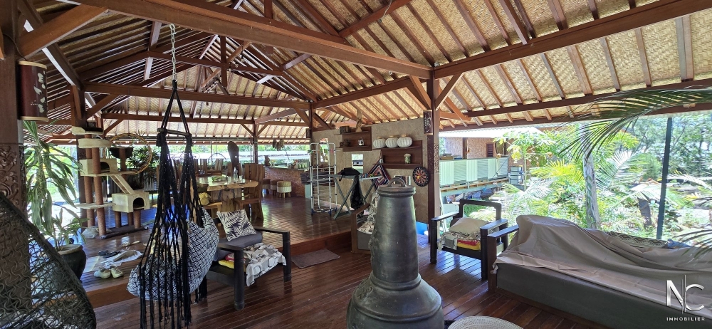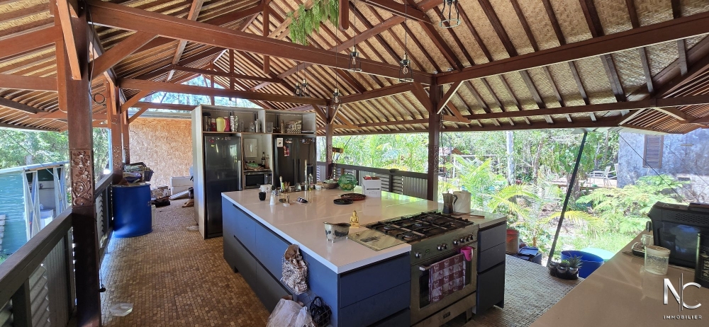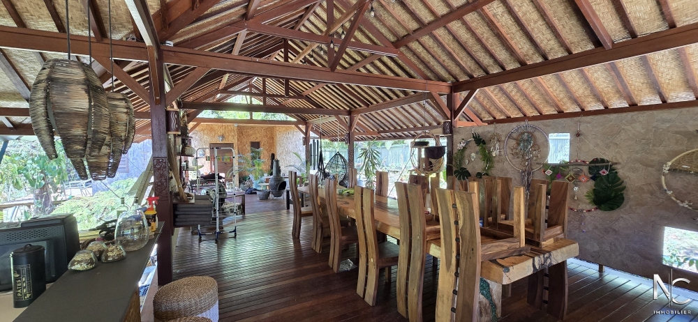 Situé dans un écrin de verdure, bien atypique d'une surface de 190 m² habitable. Cette construction en bois de style balinais offre un grand espace de vie de 90 m², totalement ouvert sur l'extérieur et donnant sur une cuisine équipée, de chez Aran Cuccine, de 25 m². A chaque extrémité de la villa se trouve un bungalow se composant d'une chambre, d'un dressing, d'une salle d'eau avec wc et d'un deck.