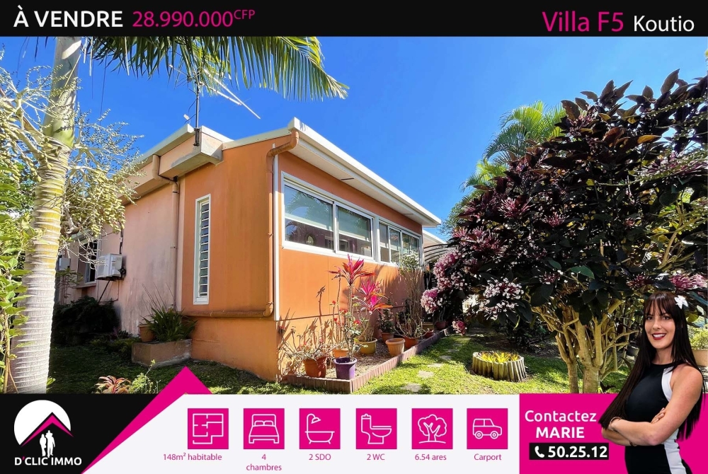 Située en impasse, dans le quartier familial très calme de Koutio SECAL, l'agence D'CLIC IMMO vous propose une très belle et spacieuse villa de type F5 de plain pieds en construction traditionnelle, datant des années 1980, de 148m² habitable + carport + terrasses, le tout sur sur un beau terrain plat, clôturé et arboré de 6,54 ares sans vis à vis.