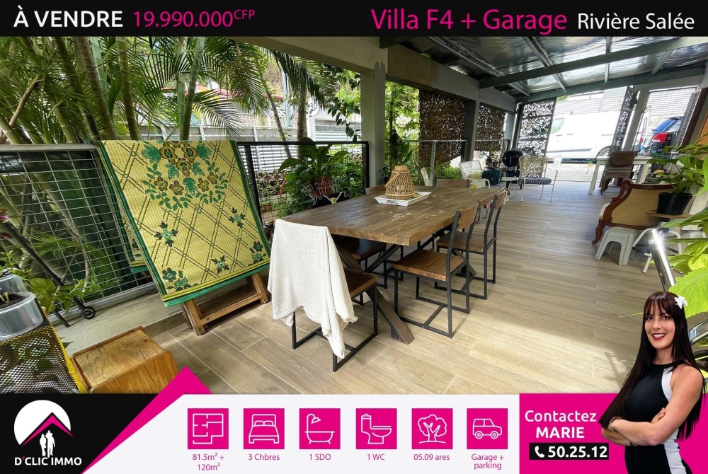 Située dans un quartier résidentiel très calme de Rivière Salée, l'agence D'CLIC IMMO vous propose en exclusivité une spacieuse villa individuelle de plain pieds en construction traditionnelle de type F4 datant des années 70 de 81.50m² habitable + 120m² de terrasses et annexes, le tout sur un beau terrain plat de 5.09 ares sans vis à vis.