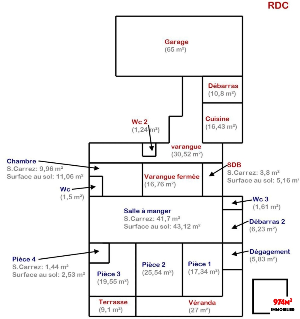 - RDC: trois pièces donnant sur une varangue et terrasse, une grande salle à manger, une cuisine et abri de voiture