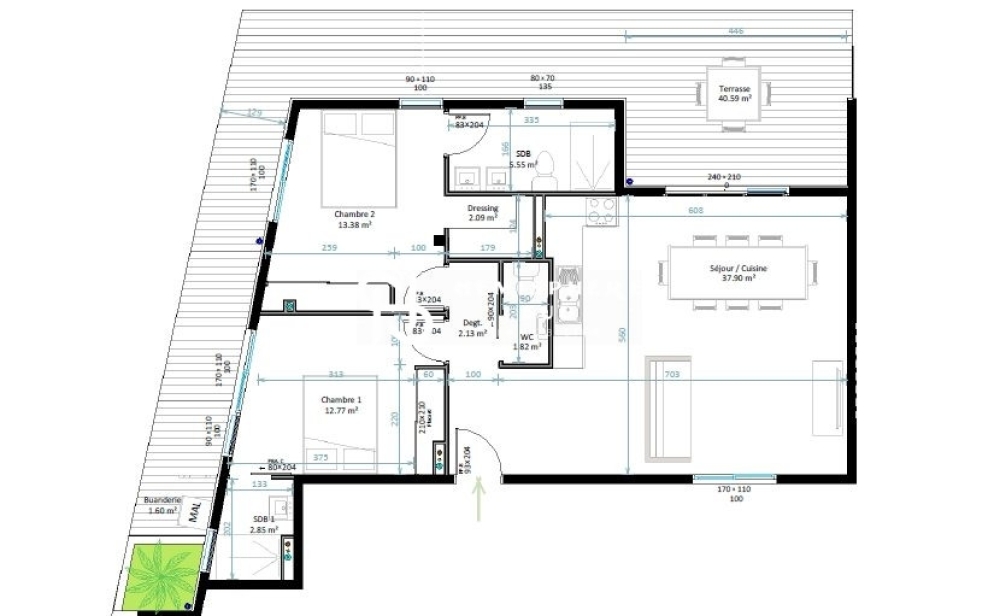 Superbe F3 en attique composé d'un grand séjour avec cuisine, de deux chambres, de deux salles de bains et d'une très grande terrasse de 41 m², et trois emplacements de stationnement.