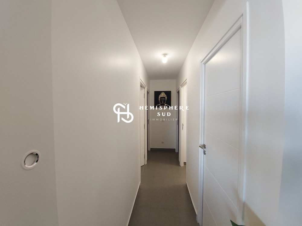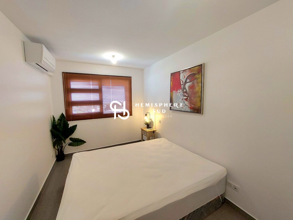 Disposant d'une spacieuse terrasse couverte de 30 m² environ, il est composé d'un salon avec une cuisine ouverte très fonctionnelle, de deux chambres climatisées, d'une salle de bains, et d'un WC séparé.