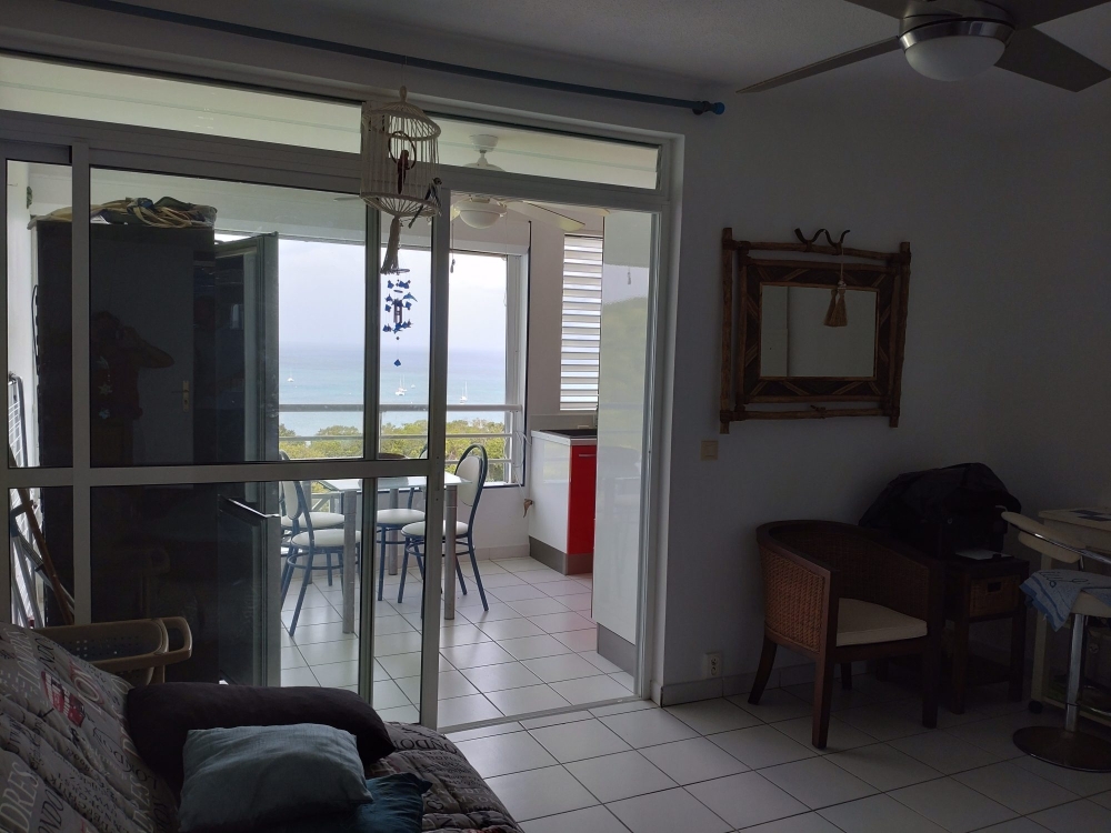 À vendre à Sainte-Anne (97227) : appartement de 32 m² au 4e étage d'un immeuble. Le T2 se compose comme suit : une pièce à vivre, une chambre, une cuisine aménagée équipée et une salle d'eau. En annexe, on trouve une place de parking et une terrasse (10 m²). Vue sur la mer. Coup de coeur.