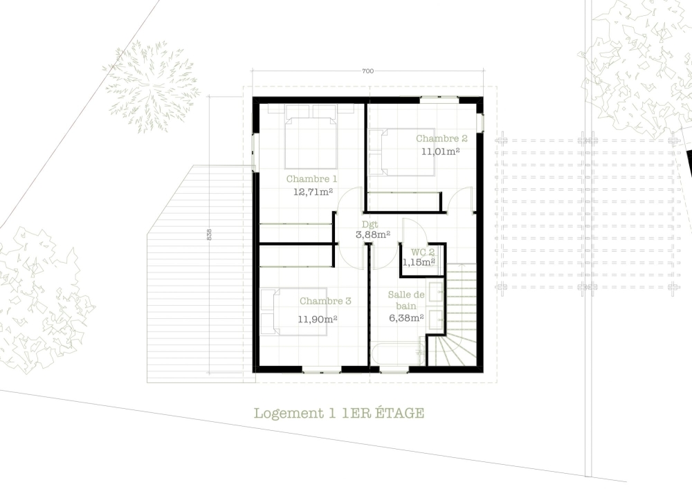 À l'étage, l'espace nuit se compose de trois chambres confortables, bien agencées pour convenir à toute la famille, ainsi qu'une salle d'eau moderne équipée d'une douche à l'italienne. Les WC sont séparés pour un confort supplémentaire.