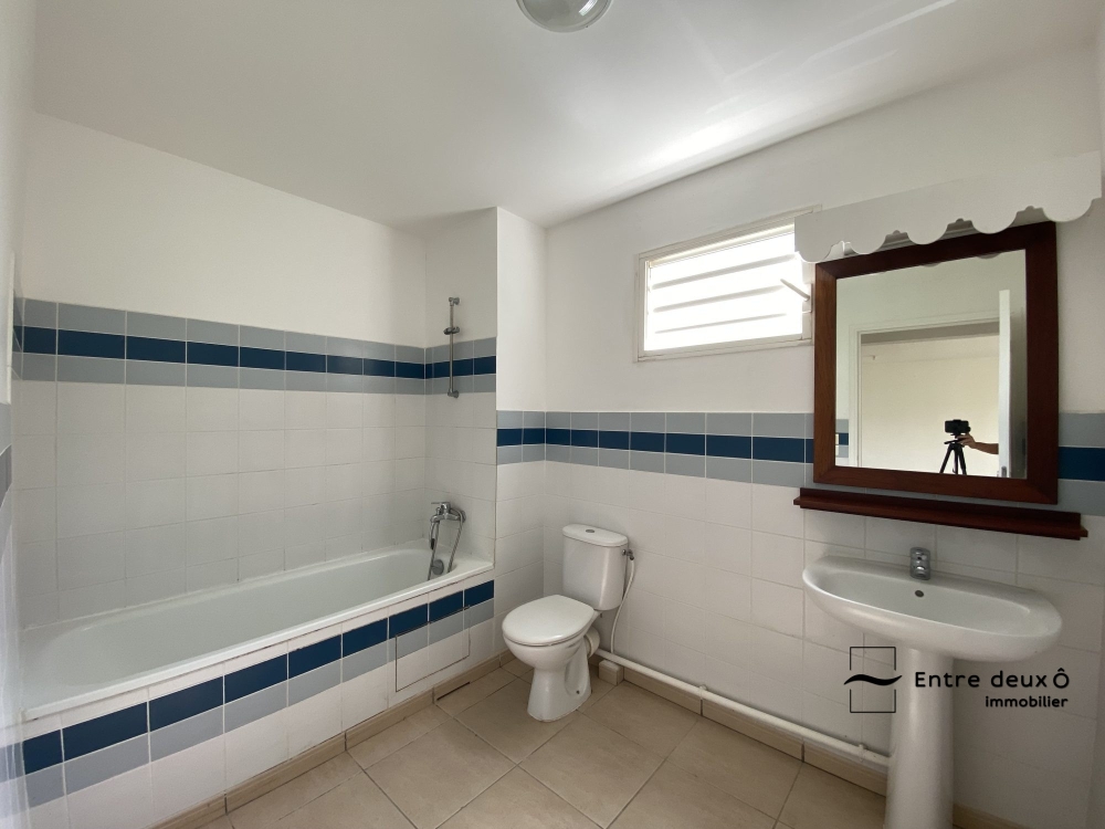 Un couloir vous mènera à une chambre, équipée de rangements et de climatisation et à une salle de bain équipée d'une baignoire, d'un lavabo et d'un wc