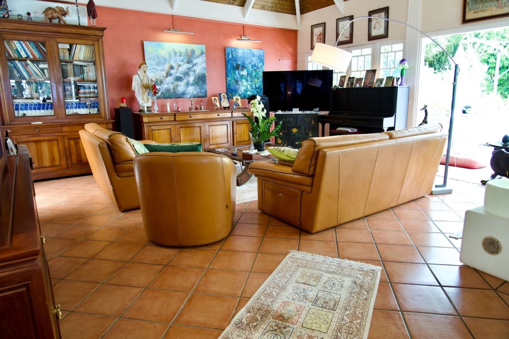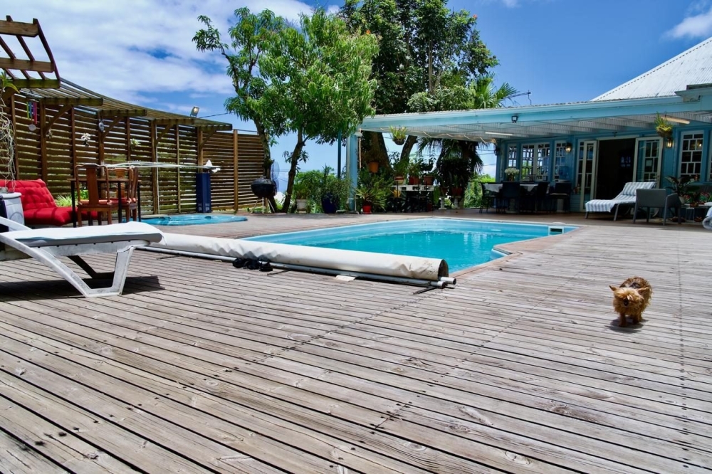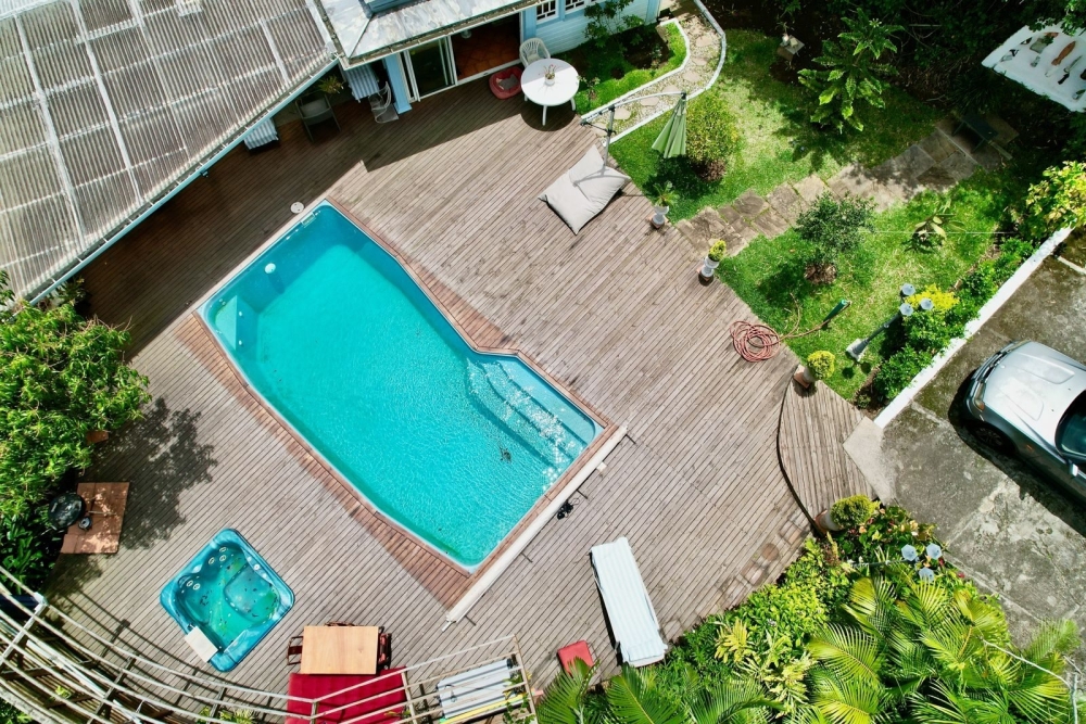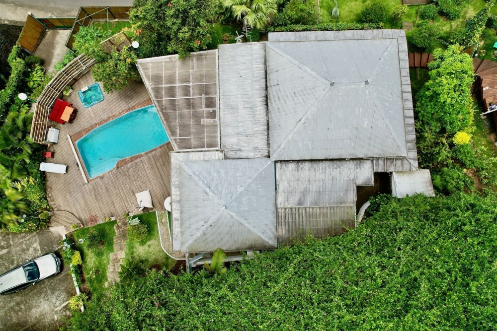 Elle est édifiée sur un terrain de 2340 m2 avec piscine au sel chauffée, jacuzzi, parc à poule, débarras et air de stationnement .