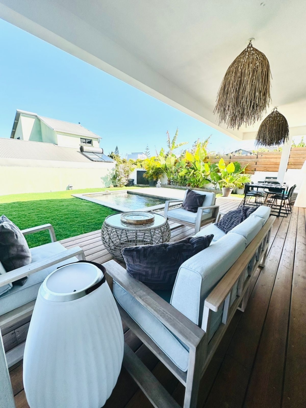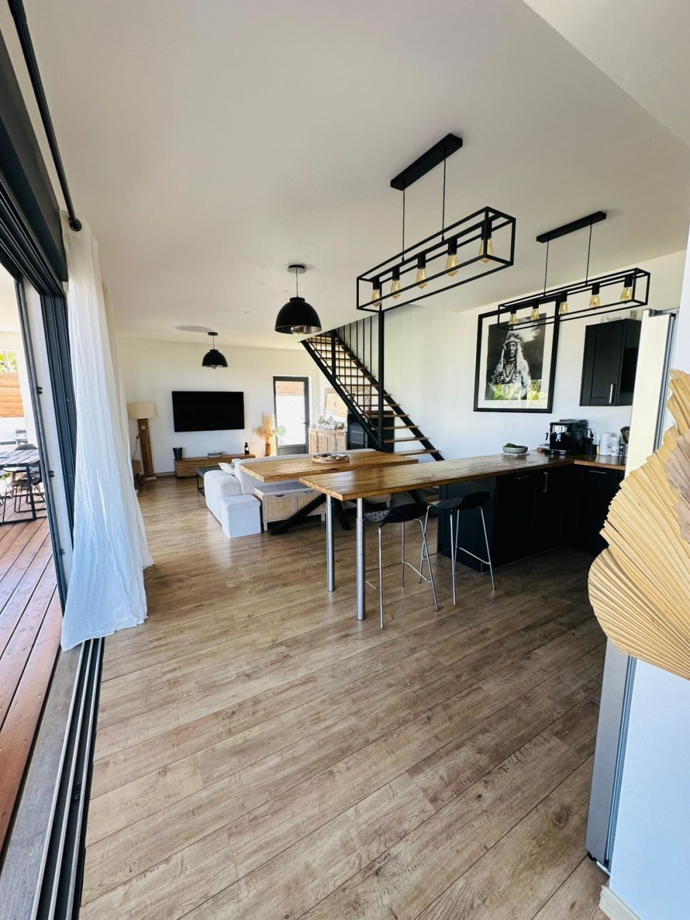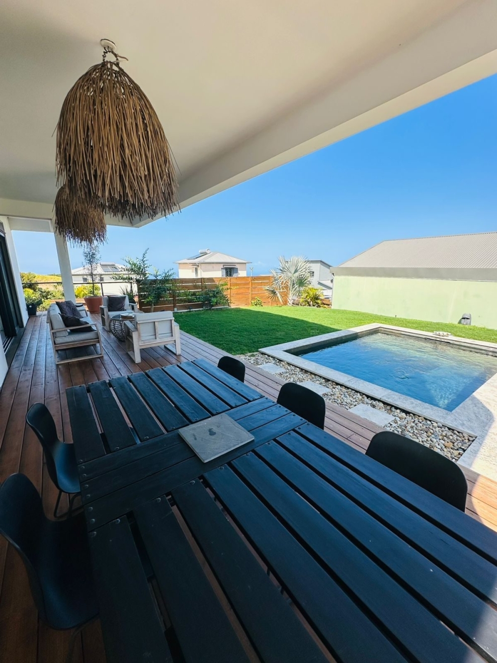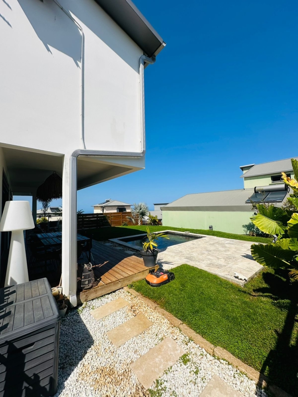 La villa se compose d'une séjour donnant sur la terrasse, d'une cuisine équipée et ouverte sur le séjour et d'une buanderie.