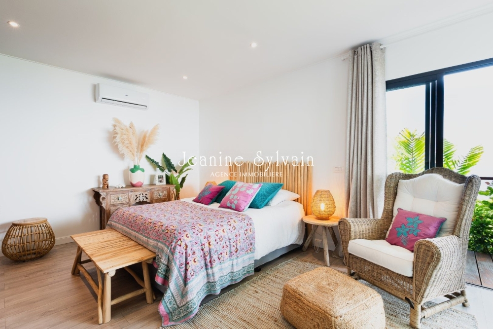 Cette maison de plain pied offre un bel espace de vie, chaleureux et confortable, des espaces nuit privatifs avec ses 4 chambres, ses 3 salles d'eau, l'ensemble décorés avec grand soin. Les larges terrasses couvertes vous offrent des points de vue superbes sur le lagon et ses couchés de soleil uniques.