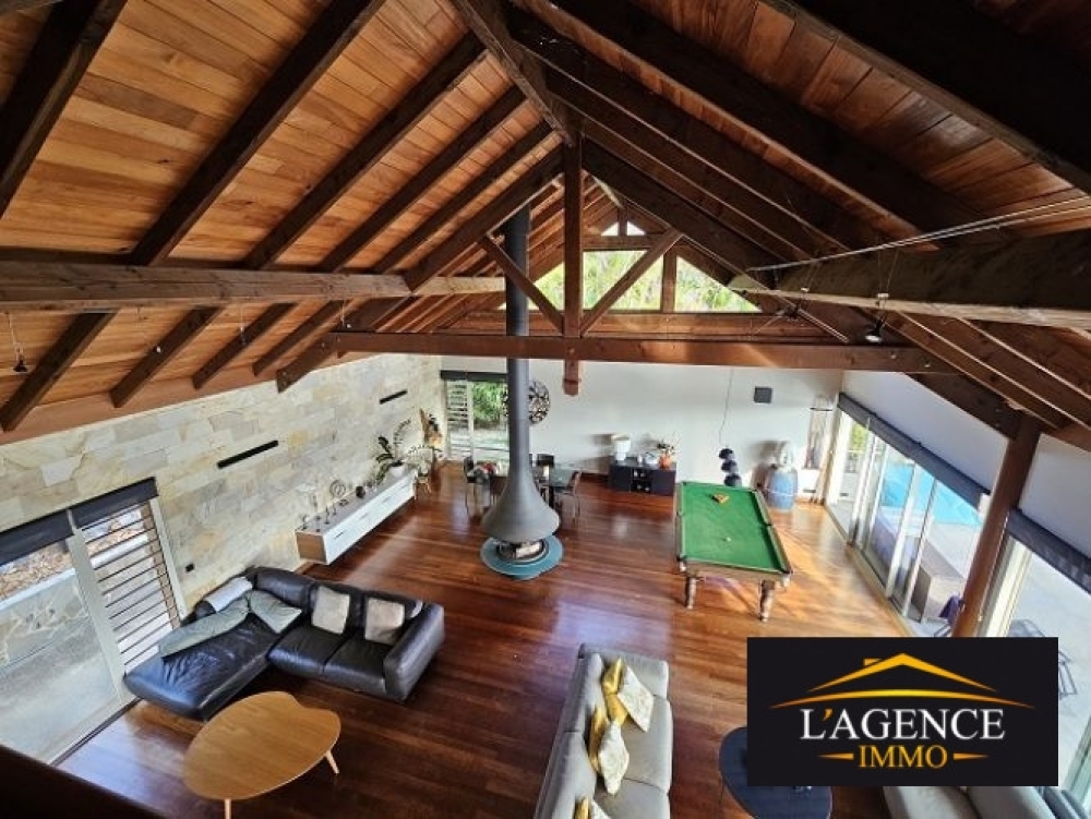 Rez-de-chaussée :Un vaste séjour cathédrale avec charpente apparente et cheminée suspendue, une cuisine moderne entièrement équipée avec îlot central, une buanderie, un bureau, une suite parentale climatisée avec terrasse, dressing et salle de bains complète, ainsi qu'un WC indépendant.
