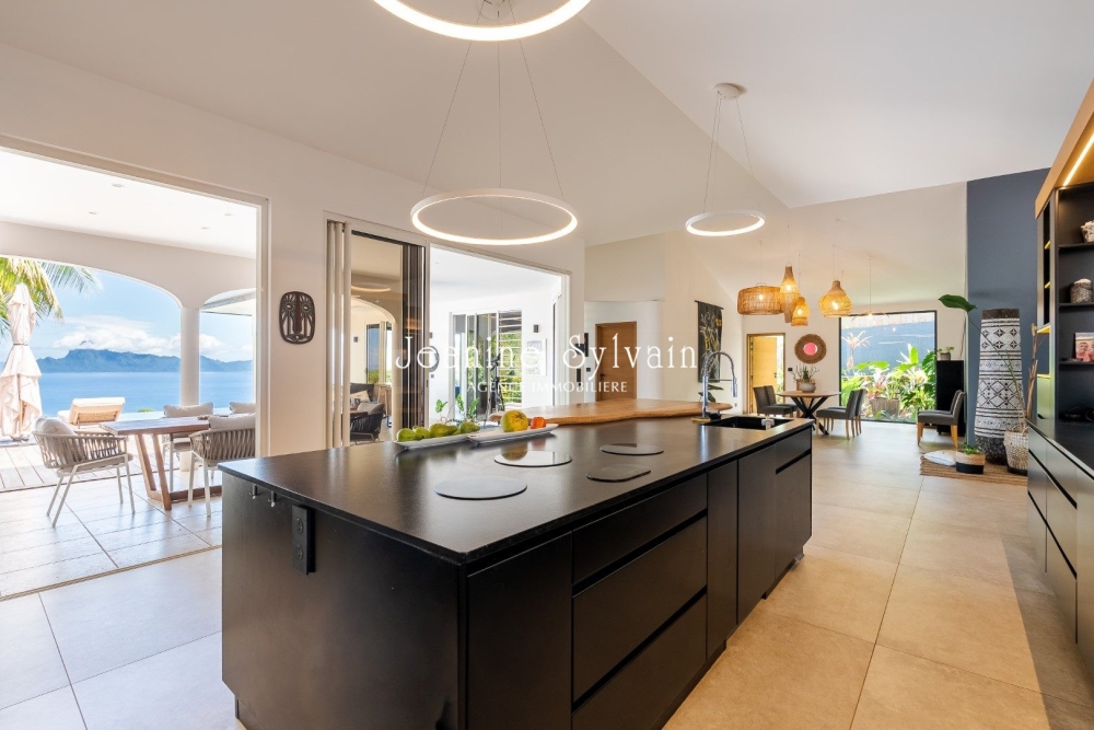 Sur les hauteurs de Punaauia avec vue Moorea plein cadre, villa de prestige entièrement rénovée en 2022, aménagée et décorée par un architecte d'intérieur.