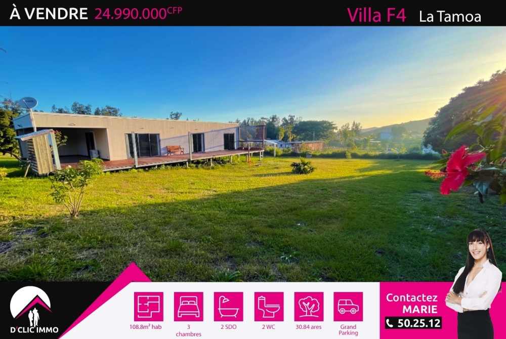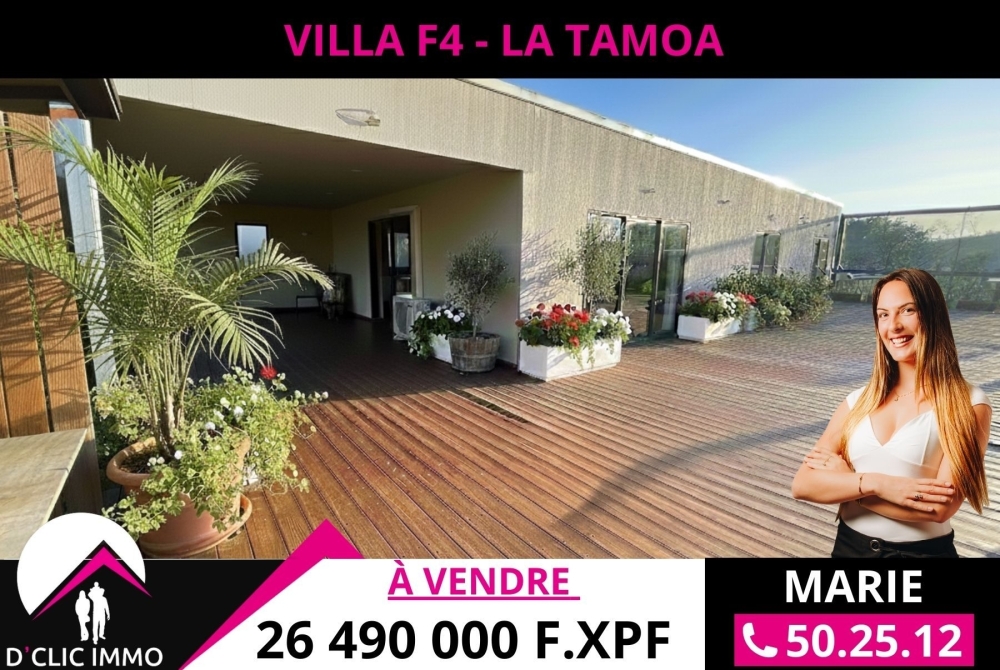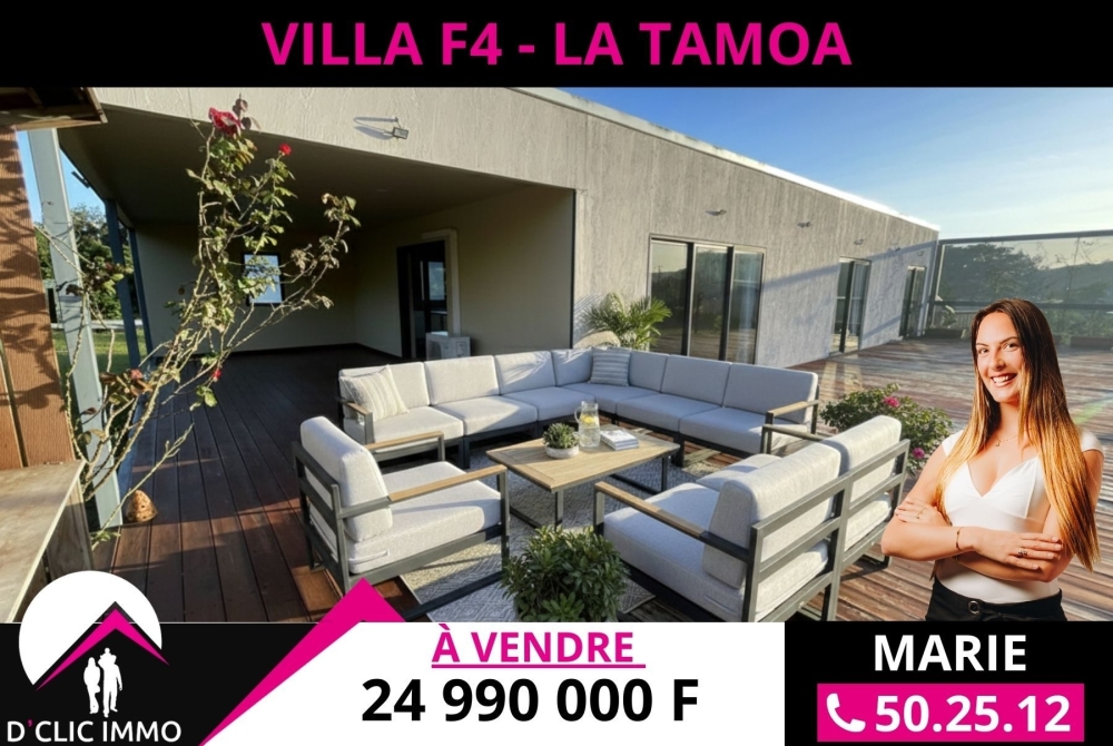 Idéalement située dans un quartier résidentiel de La Tamoa, , l'agence D'CLIC IMMO vous propose une superbe villa individuelle, en construction fibrociment sur pilotis, datant de 2019, de type F4 d'une surface de 108.80m² habitable + 110 m² de terrasses le tout sur un beau terrain plat de 30.84 ares en zone non inondable.