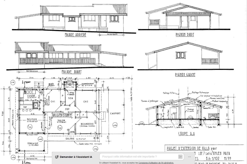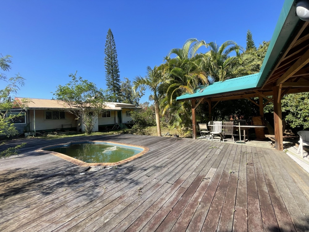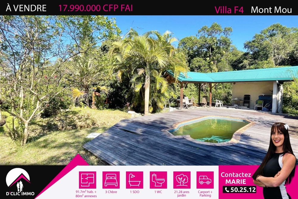 Située en impasse, dans le quartier résidentiel très calme du Mont Mou, l'agence D'CLIC IMMO vous propose en exclusivité une charmante villa de type F4 en construction bois pour la villa d'origine datant des années 70, et construction traditionnelle sur plots béton pour l'extension datant de 2000, couverture en tôles, charpente en bois et galva, le tout de 91.70m² habitable + 80m² de terrasses et annexes + piscine et deck + stationnement sécurisé (deux entrées sur le terrain) + dock au fonds du jardin à refaire, sur un beau terrain plat et arboré de 21.28 ares sans vis à vis avec accès à un creek.
