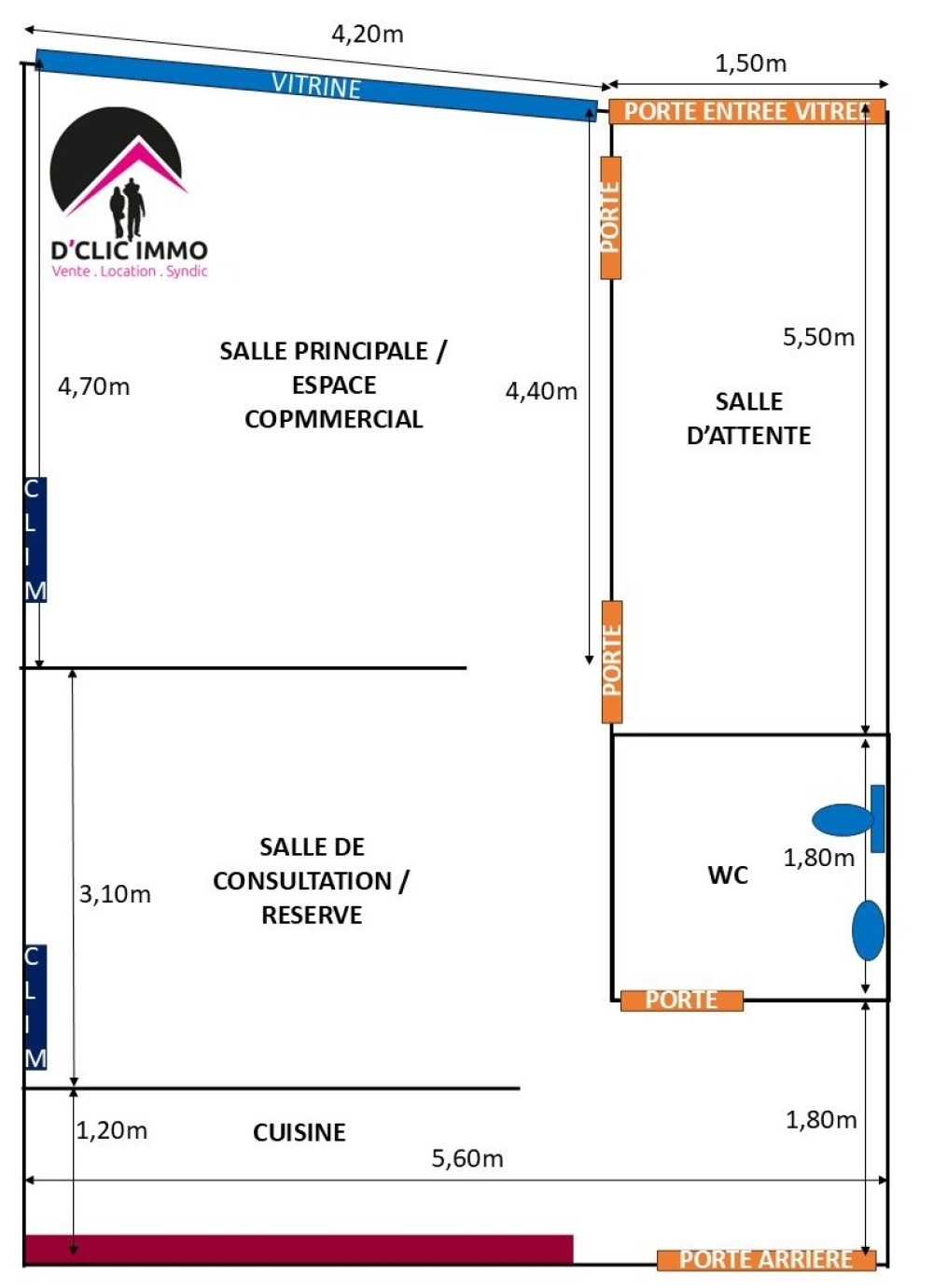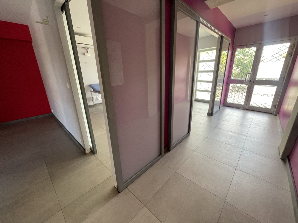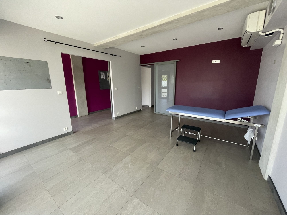 Il est composé d'une salle d'attente de 8.25m², d'une pièce avant de 18.65m² climatisée, d'une pièce arrière de 12.70m² également climatisée, d'une cuisine meublée de 8.30m² et d'un WC séparé avec lave main de 2.70m².