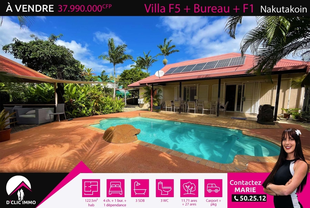 Idéalement située dans le quartier résidentiel et familial très calme de Nakutakoin, l'agence D'CLIC IMMO vous propose en exclusivité une superbe villa de type F5 + bureau + dépendance, en construction traditionnelle datant de 2009, de 122.5m² habitable + plus de 100m² d'annexes et terrasses couvertes, le tout sur un beau terrain plat et arboré de 11,71 ares plats + environ 27 ares de zone maritime soit environ 38.71 ares privatifs au total, sans vis à vis.