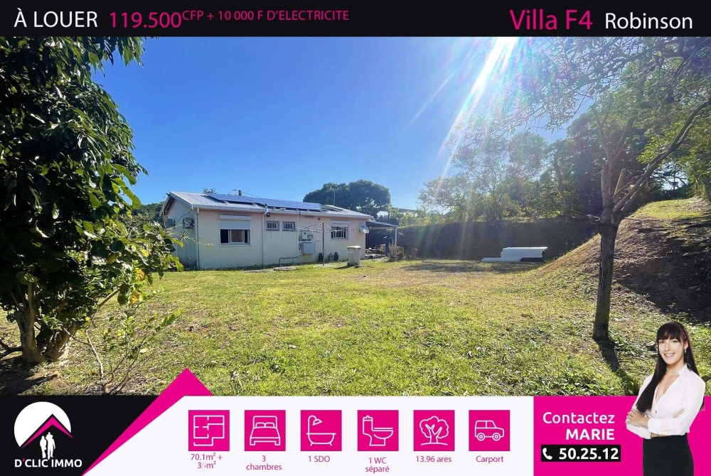Idéalement située dans un quartier résidentiel très calme de Robinson, l'agence D'CLIC IMMO vous propose en exclusivité une spacieuse villa de type F4, de plain pieds, en construction traditionnelle d'une surface de 70.10m² habitable + 35m² de terrasses et carports sur un beau terrain plat de 13.96 ares clôturé entièrement.