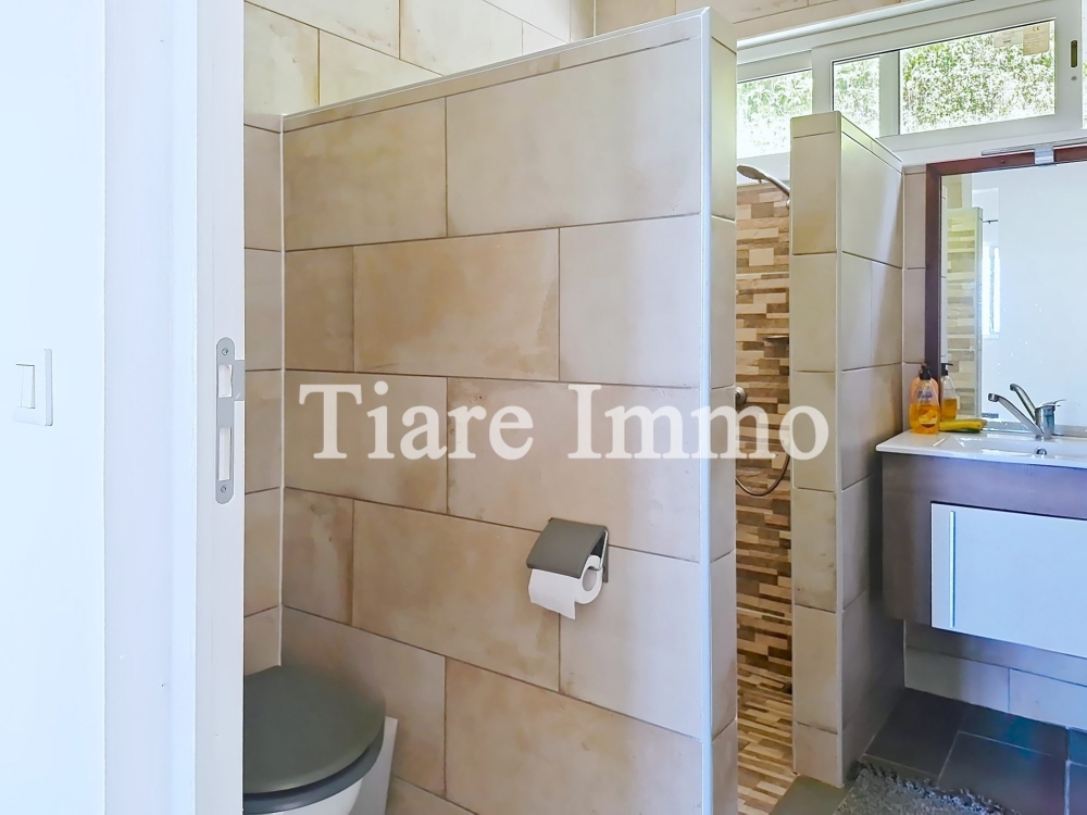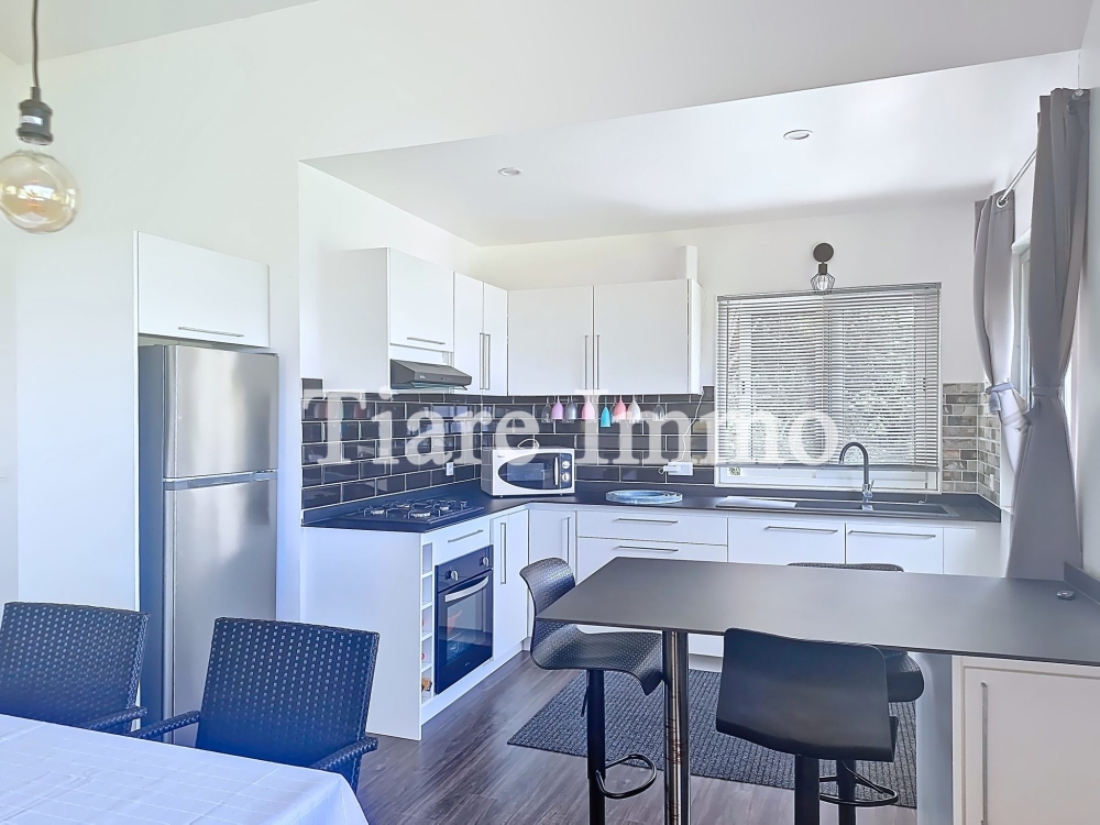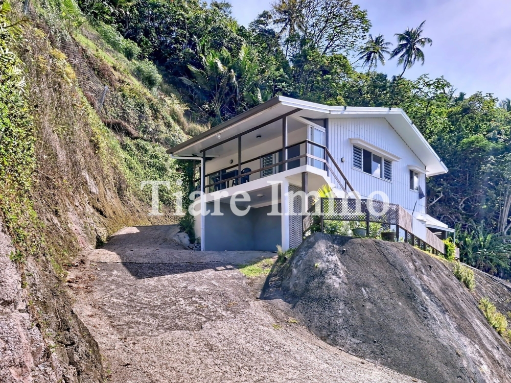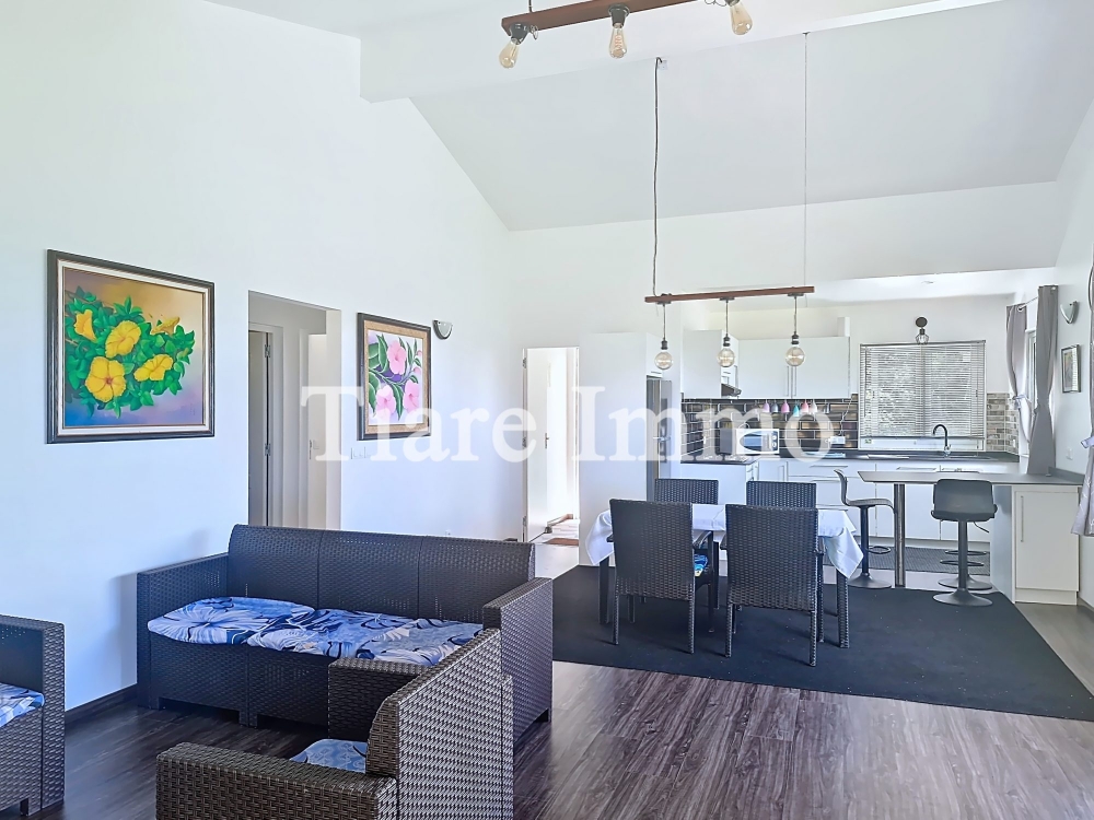 Sur les hauteurs d'Afaahiti, dans un quartier calme et ventilé, belle maison contemporaine T3 meublée et équipée, construite en 2022, offrant une vue panoramique sur la mer et la côte Est.