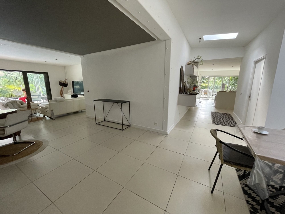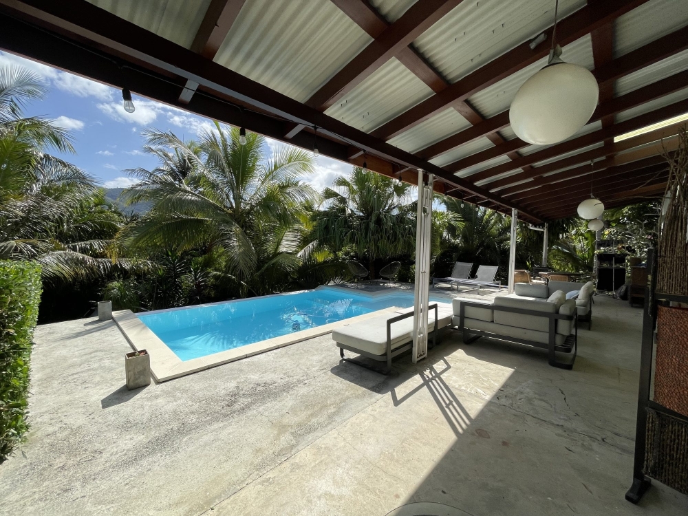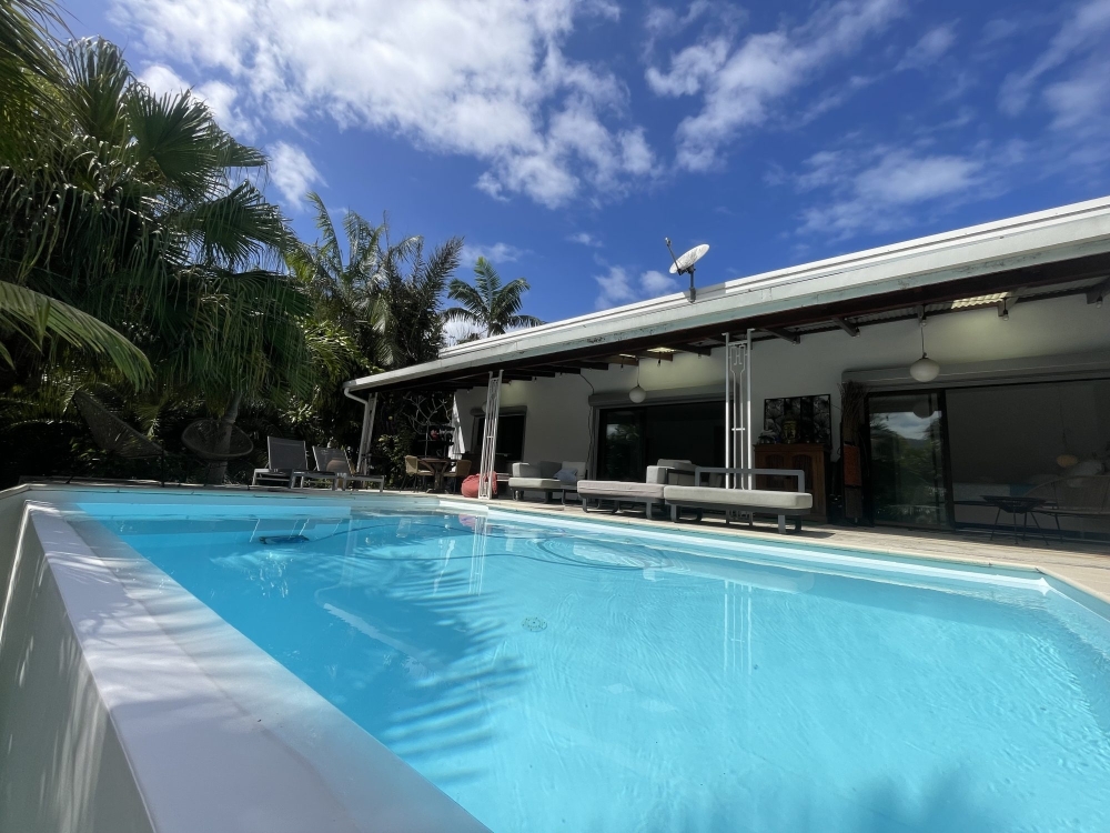En extérieur, la villa dispose de superbes espaces de vie ! Une grande terrasse couverte dans le prolongement du séjour donnant sur une grande piscine à débordement, avec vue jardin et montagnes, un faré, une terrasse côté cuisine, le tout sur un superbe terrain arboré et aménagé de 10.80 ares, clôturé et sécurisé par un portail électrique.