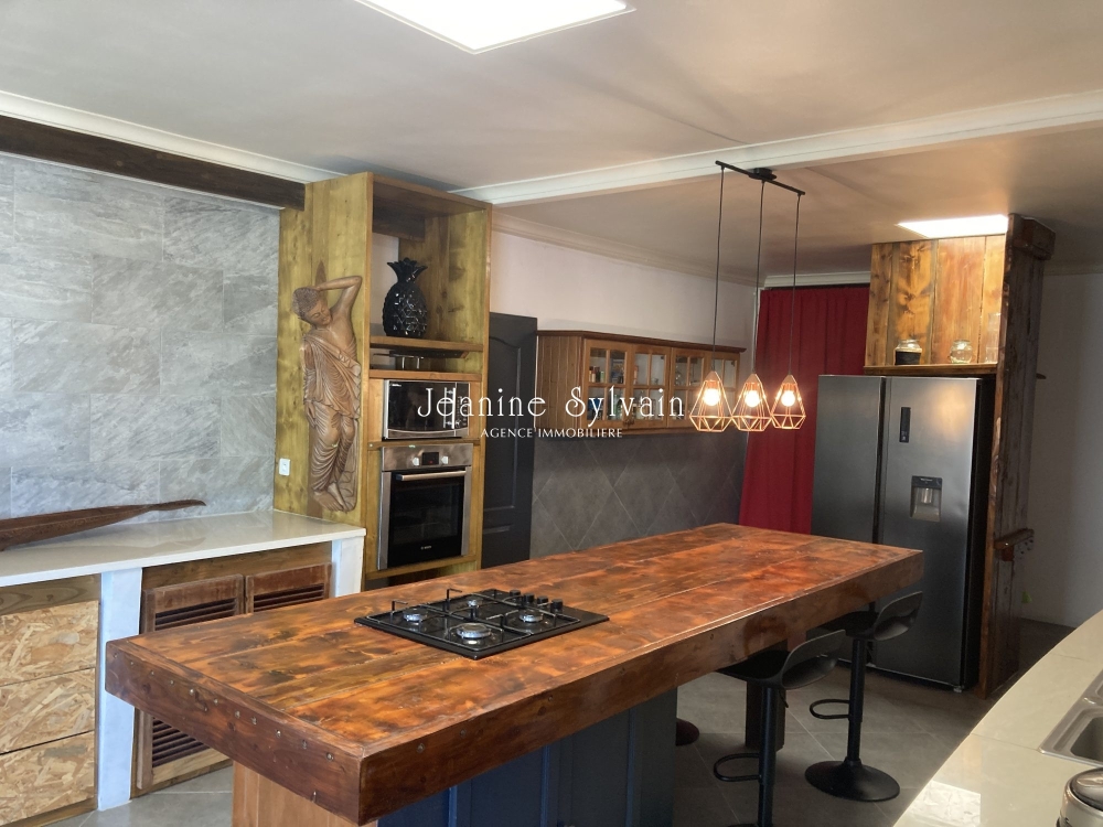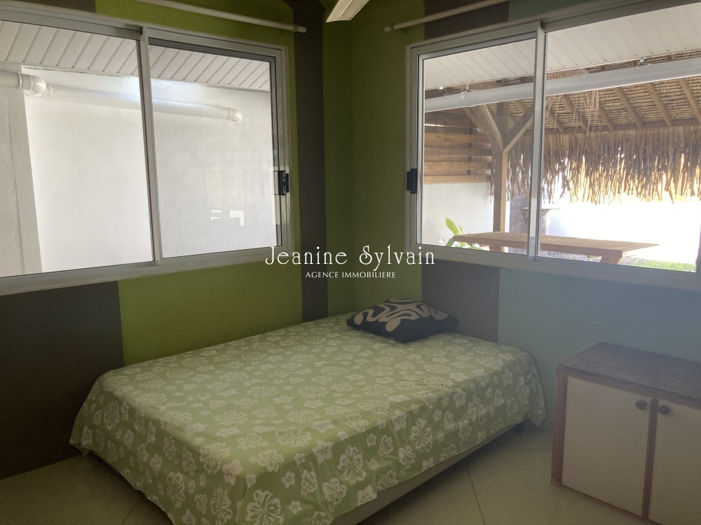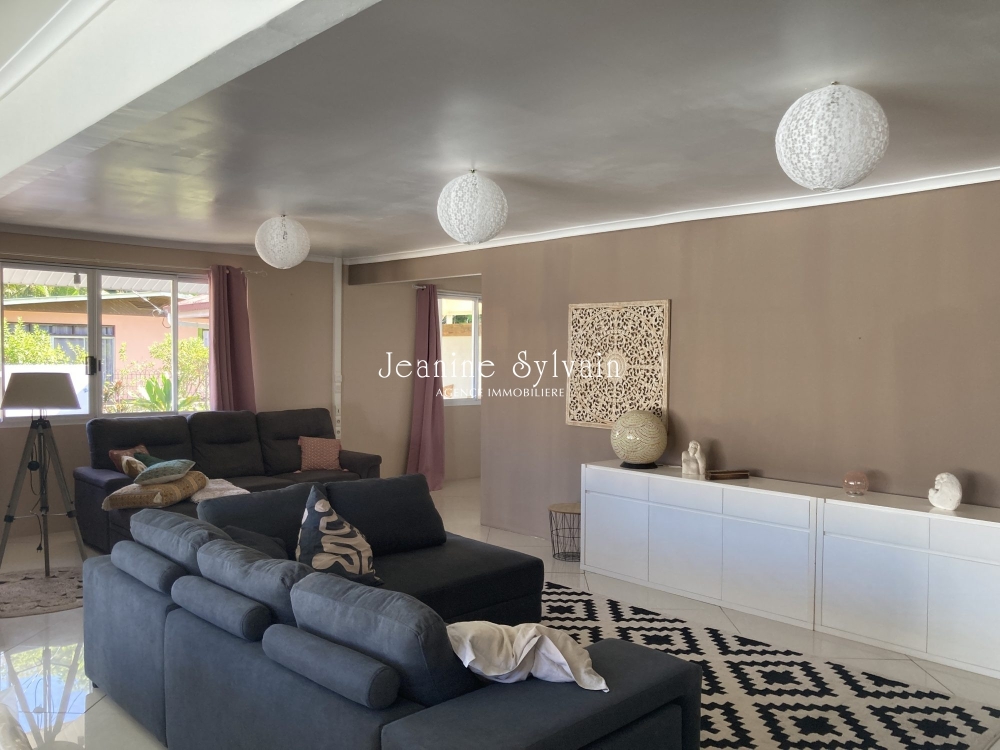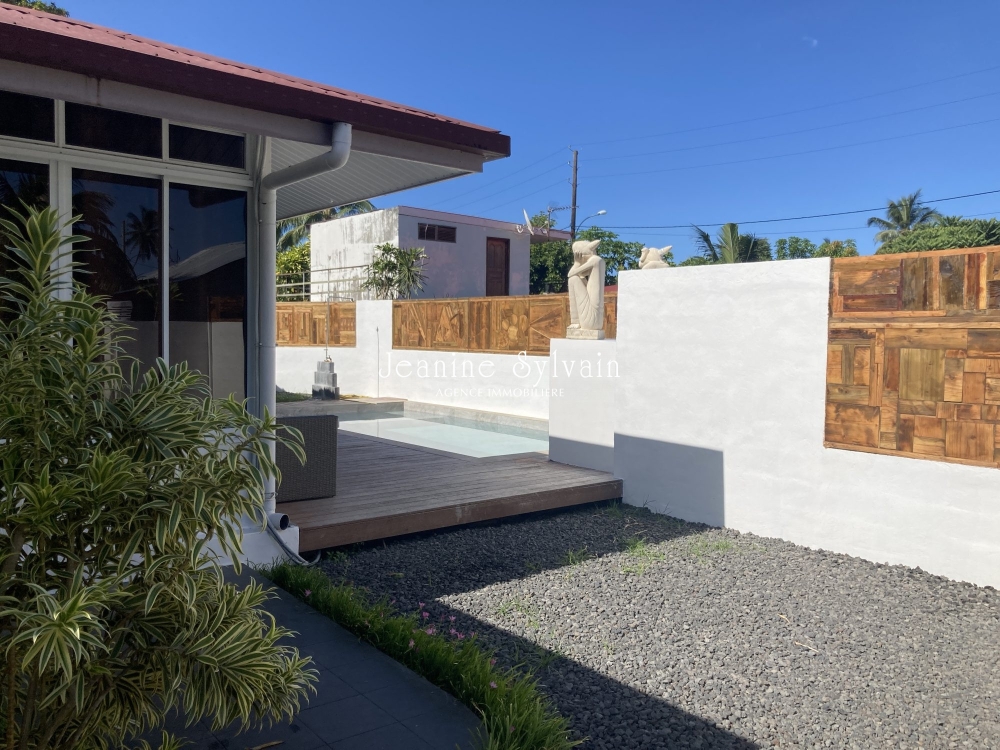 Paea, bon environnement, villa bien rénovée moderne et bien décorée, avec très grande cuisine aménagée et équipée, vaste séjour donnant sur la terrasse, fare potee, 3 chambres, 2 salles d'eau, garage couvert, jardin, piscine carrelée, entièrement clôturé avec portail manuel.