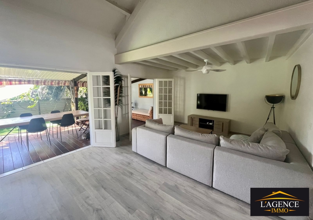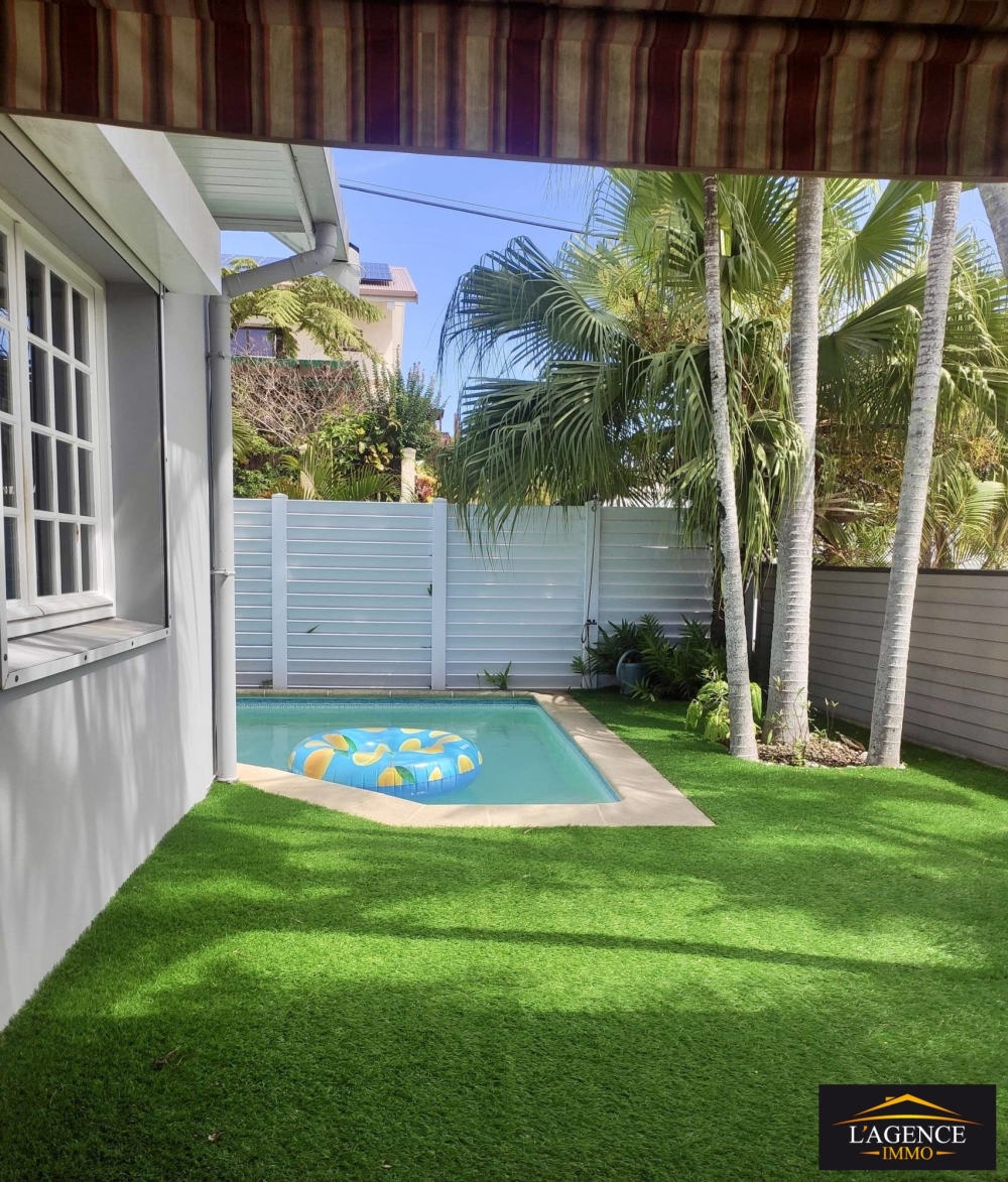 En extérieur, une grande terrasse couverte en deck donnant sur le coin jardin et une piscine avec son espace solarium.