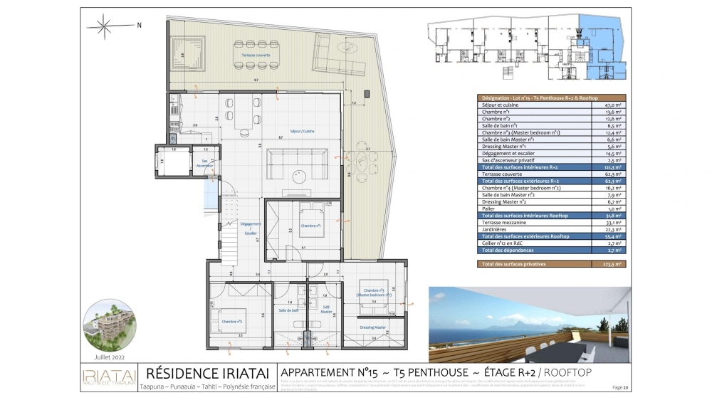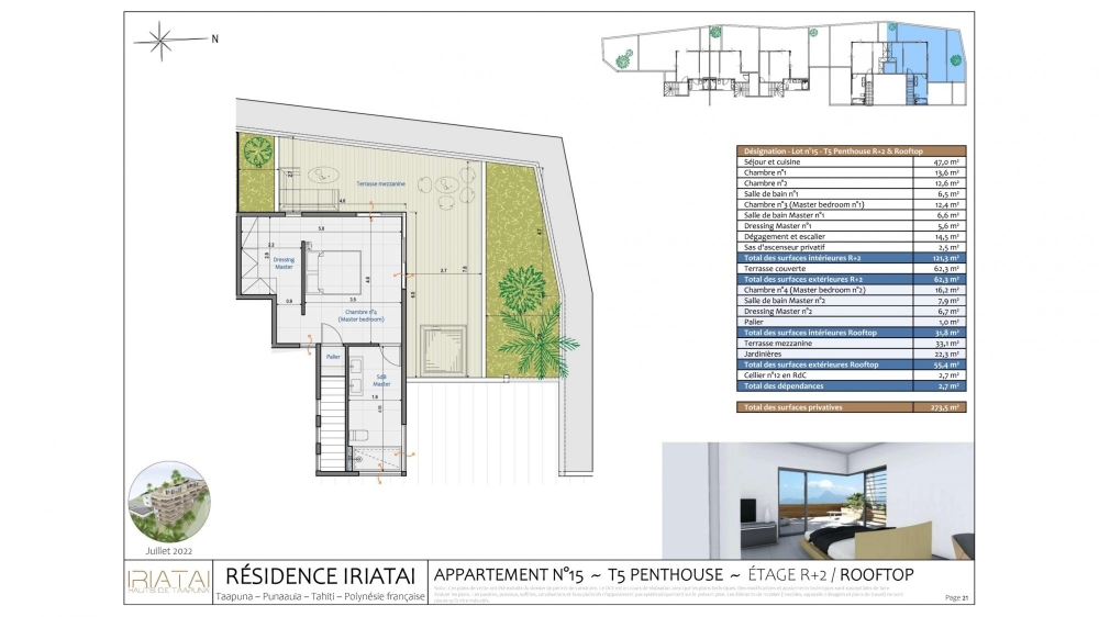 Au sein de la prestigieuse résidence IRIATAI, ensemble exclusif de 15 logements haut standing, découvrez un Penthouse F5 en duplex offrant une vue imprenable sur Moorea ? et un cadre naturel d'une rare sérénité. Ce bien d'exception propose 153 m² habitables pour une surface totale de 248,5 m², auxquels s'ajoutent 22 m² de jardinière privative ?, portant l'ensemble à 270,8 m² d'espace conçu pour un confort absolu.