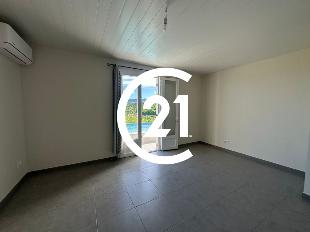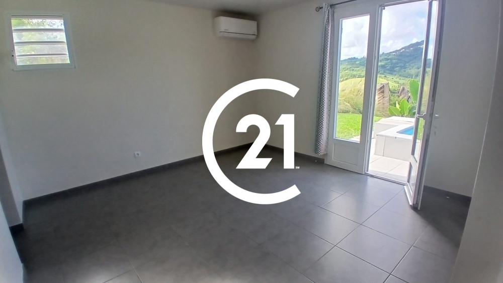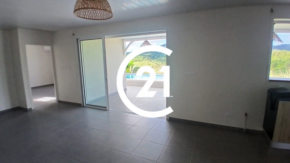 Un grand séjour/cuisine qui donne sur la terrasse et la piscine