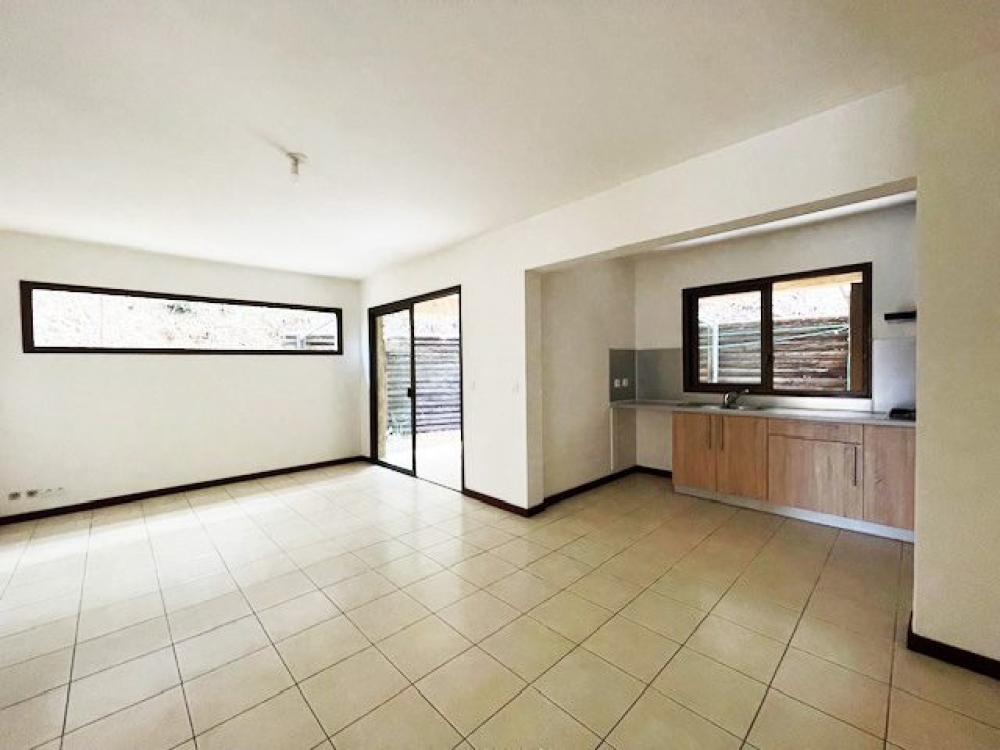 Partie jourLe séjour lumineux s'ouvre sur une terrasse couverte de 13 m² et un jardin privatif d'environ 20 m², offrant un véritable prolongement de l'espace de vie. La cuisine meublée et équipée (plaque et hotte) apporte praticité et confort au quotidien.