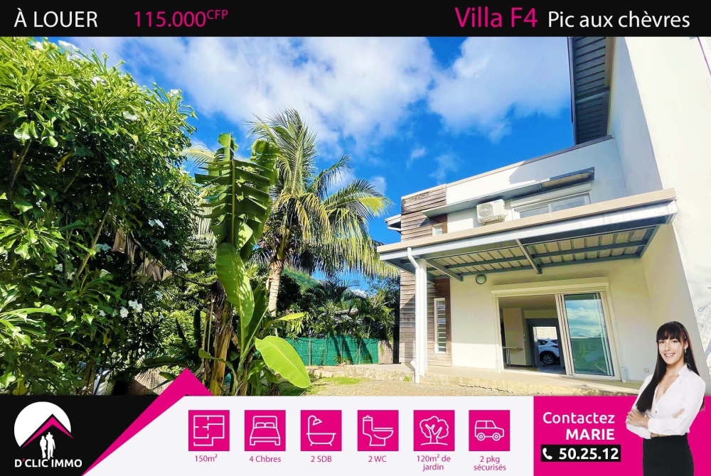 Dans le quartier de Pic aux Chèvres à DUMBEA, l'agence D'CLIC IMMO vous propose une spacieuse villa mitoyenne en duplex très lumineuse de type F4 de 103.32 m² habitable + 18.76m² de terrasse + 120m² de jardin clôturé + 2 parking privatifs et sécurisés.