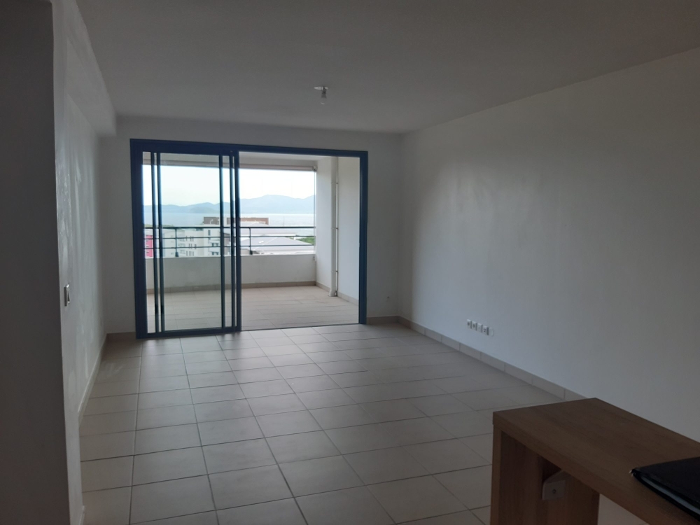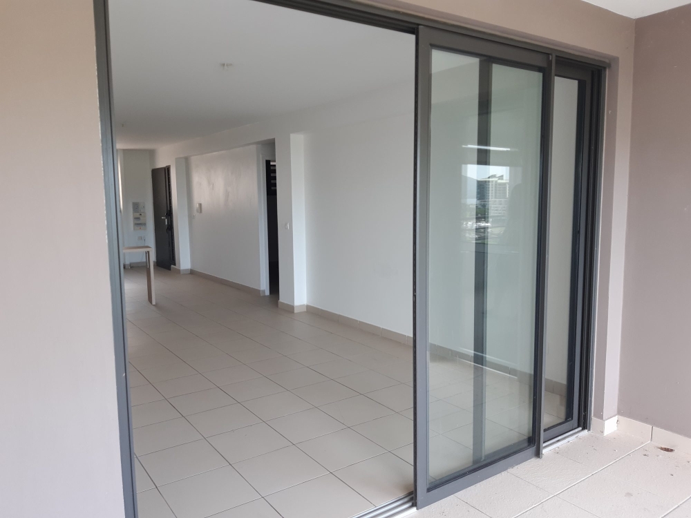 La baie vitrée coulissante du séjour vers la terrasse, permet à cet appartement de profiter de la luminosité à toute heure.