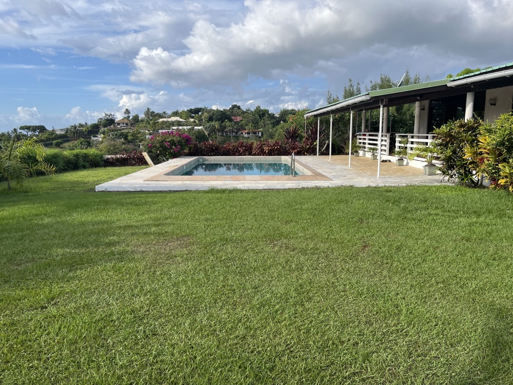 OPPORTUNITE RARE ! PUNAAUIA : Dans résidence de standing ' LE LOTUS', jolie villa familiale de plein pied ( 150 M2 hab. F5) , belle distribution , salon , espace salle à manger , grande terrasse donnant sur le jardin et la piscine , 4 chambres dont une parentale avec sa SDB privative . 3 chambres avec SDE double vasque) pleine vue dégagée mer et montagne , calme absolu, portail , belle végétation , arbres fruitiers , terrain plat et clos de 1200 m2 , prix : 139.9 M .