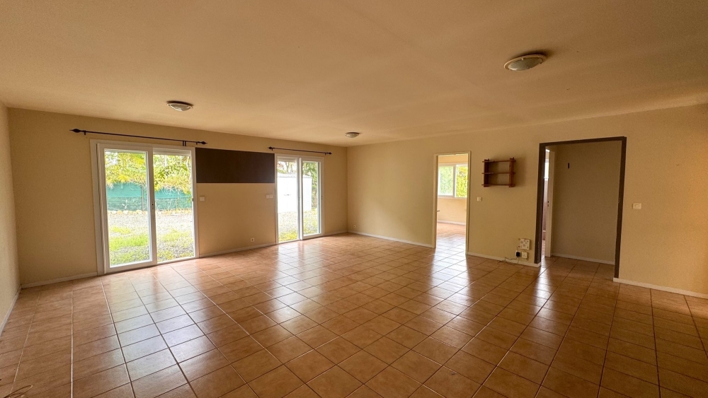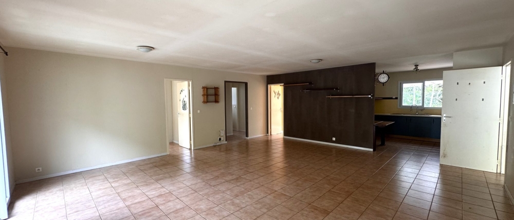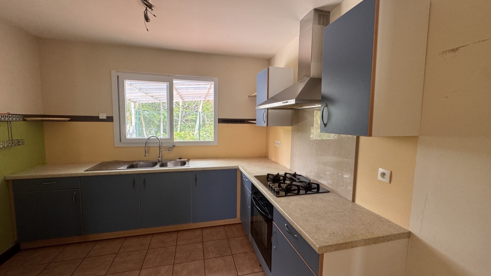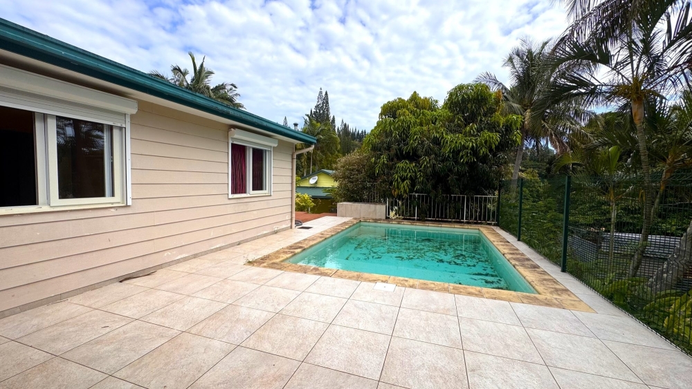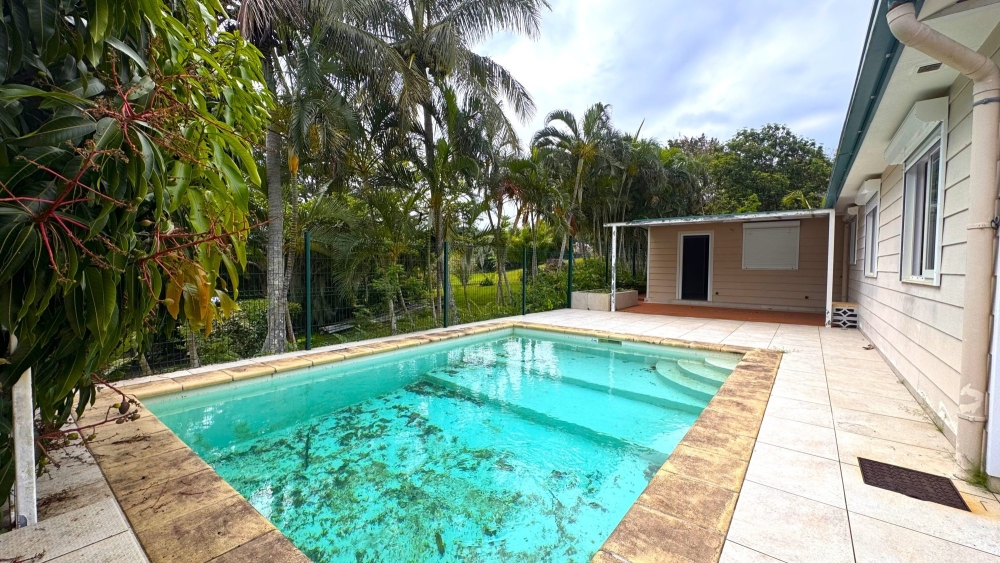 En fond d'impasse, sur un terrain clôturé de 6ares, Villa d 'environ 120m² en ossature métallique comprenant : cuisine équipée ouverte sur séjour , 3 chambres avec placards, une salle d'eau , un studio avec salle d'eau, buanderie , carport et piscine