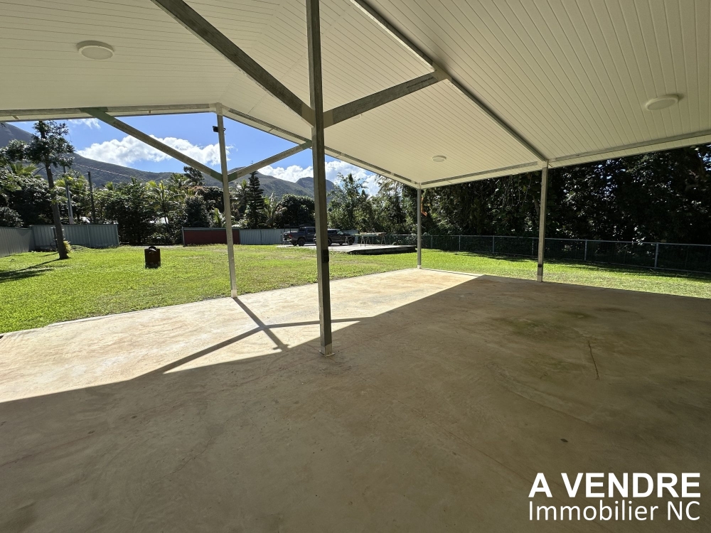 Sur l'avant de la villa une grande terrasse couverte prolongée sur le côté et accédant à la cuisine.