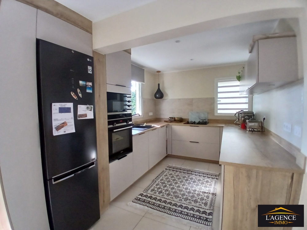 Très lumineuse et sans vis-à-vis, elle se compose d'une cuisine moderne équipée, ouverte sur un bel espace de vie avec accès direct à un deck en bois, idéal pour les moments de détente. Le séjour bénéficie de placards intégrés et s'ouvre sur une agréable terrasse côté piscine.
