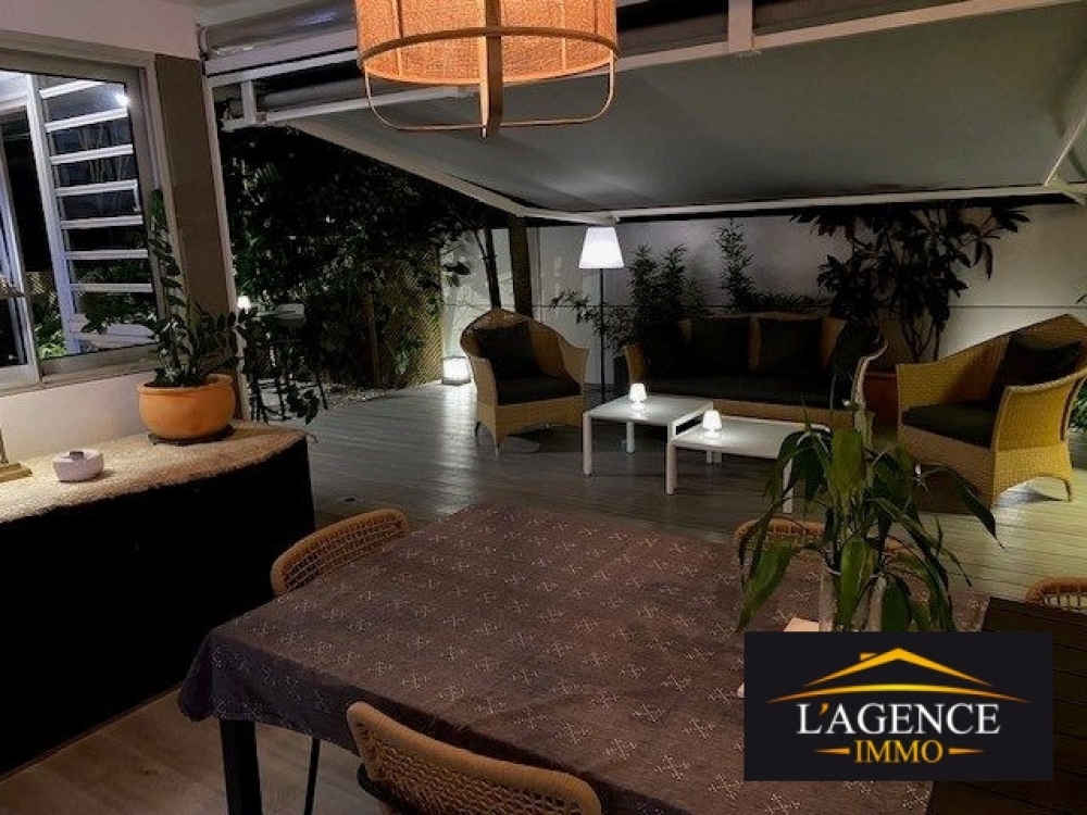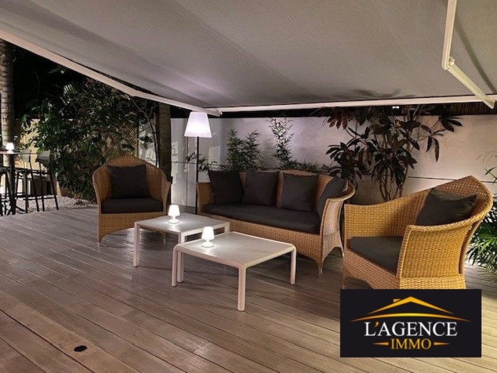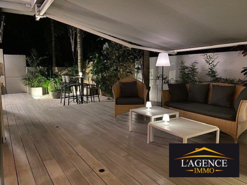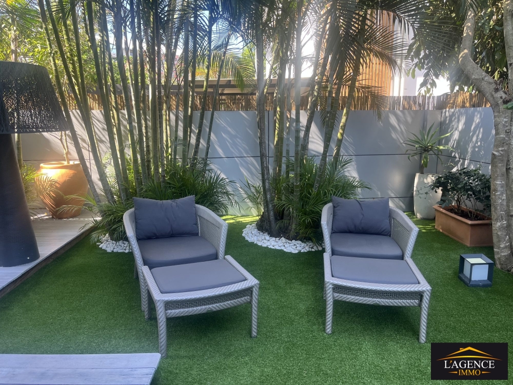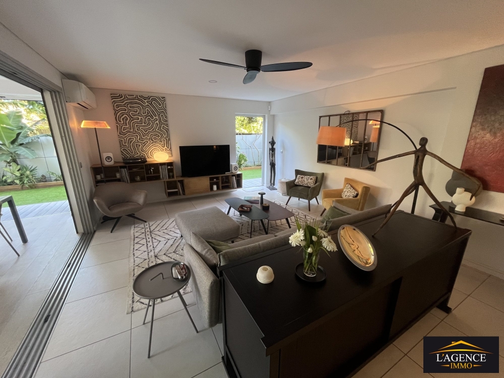 A deux pas d'une jolie plage (Résidence les pieds dans l'eau), prestations et mobilier hauts de gamme : 96 m² habitables, 160 m² de terrasses couvertes et jardin arboré et clôturé, cellier 5 m². L'appartement comprend 2 chambres avec salle d'eau donnant sur le jardin, un bureau indépendant, une cuisine américaine équipée, 2 WC, la climatisation dans toutes les pièces ainsi qu'une alarme anti-intrusion. Deux places de parking sont incluses, dont une couverte. Situé côté jardin, à l'abri des vents et des regards, ce bien offre un cadre de vie intime et sécurisé avec de beaux espaces extérieurs parfaits pour recevoir.