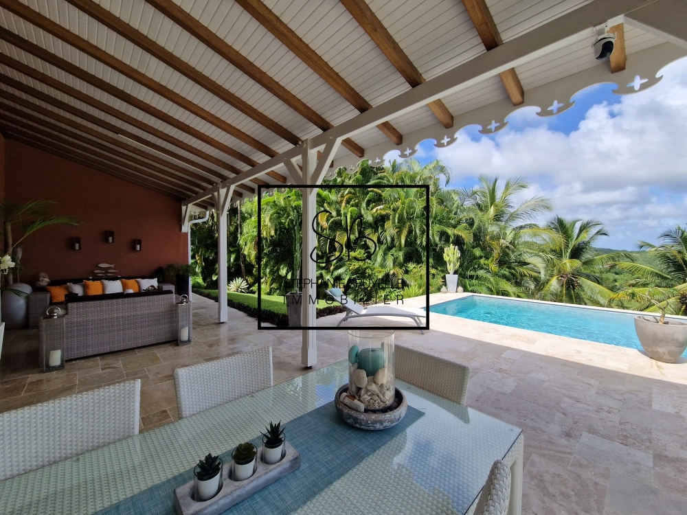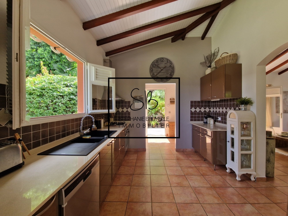 LE VAUCLIN : A proximité du Cap Est, sur les hauteurs, dans un quartier résidentiel haut de gamme au calme et sans vis à vis cette jolie villa créole de plain-pied F5 d'environ 130m² habitable et 40m² de terrasse ouverte sur la piscine vue mer répond à toutes vos attentes sous les Tropiques tant en résidence principale sur la Côte Atlantique qu'en résidence secondaire/location saisonnière. Construite sur un terrain de 1500m² clôturé superbement paysagé, amoureux des Jardins Tropicaux : le calme et la douceur de vivre y sont les maîtres mots. Composée d'un séjour de 40m² environ, une cuisine aménagée traversante (+ cellier). L'espace nuit est composé d'une suite parentale avec accès jardin/piscine (dressing, salle d'eau wc), de 3 chambres climatisées et d'une salle d'eau. La villa est orientée vue mer, ouverte sur la terrasse avec espace repas et espace salon et plage périphérique autour de la piscine pour vos bains de soleil/apéritif avec les amis. Nombreuses places de parking sur la propriété. Fosse conforme. Possibilité de construction complémentaire. Bien soumis au DPE : Catégorie C. STEPHANIE BRUYELLE IMMOBILIER au 06 96 81 11 91.