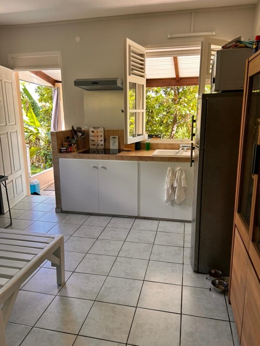 ? Une cuisine fonctionnelle entièrement équipée, ouverte sur le séjour, avec plaques de cuisson, micro-ondes, réfrigérateur et rangements.