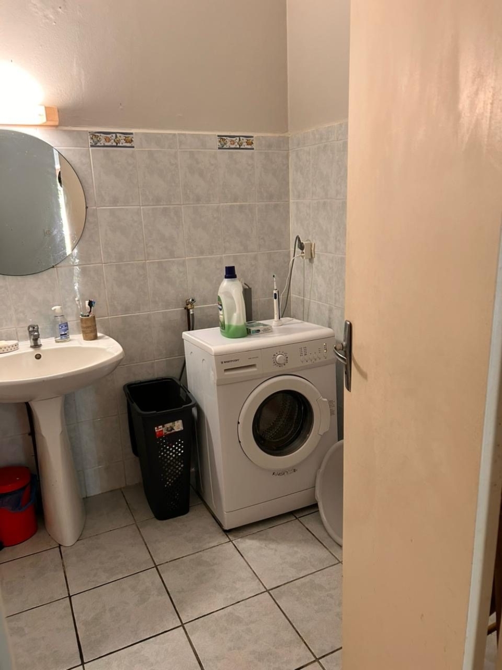 ? Une salle de bain spacieuse avec baignoire, meuble de rangement et machine à laver