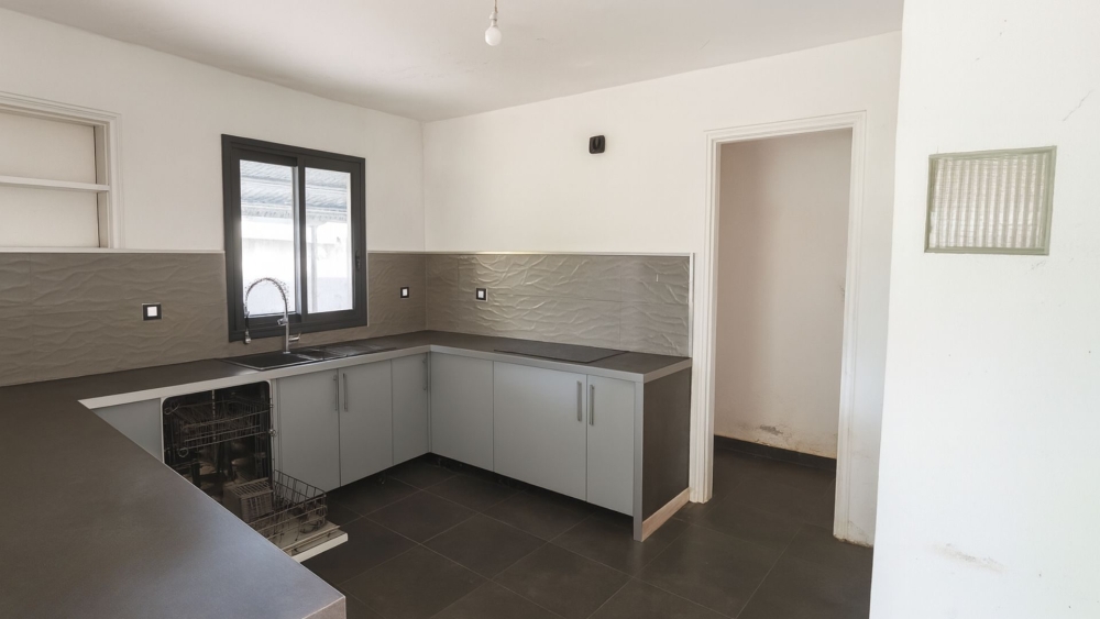 CUISINE SEMI-OUVERTE FONCTIONNELLE : La cuisine en L relie harmonieusement la salle à manger et le séjour. Son agencement pratique et sa ventilation naturelle facilitent le quotidien.
