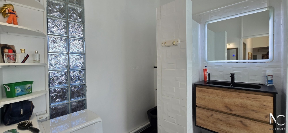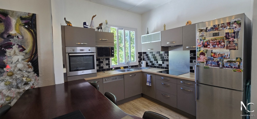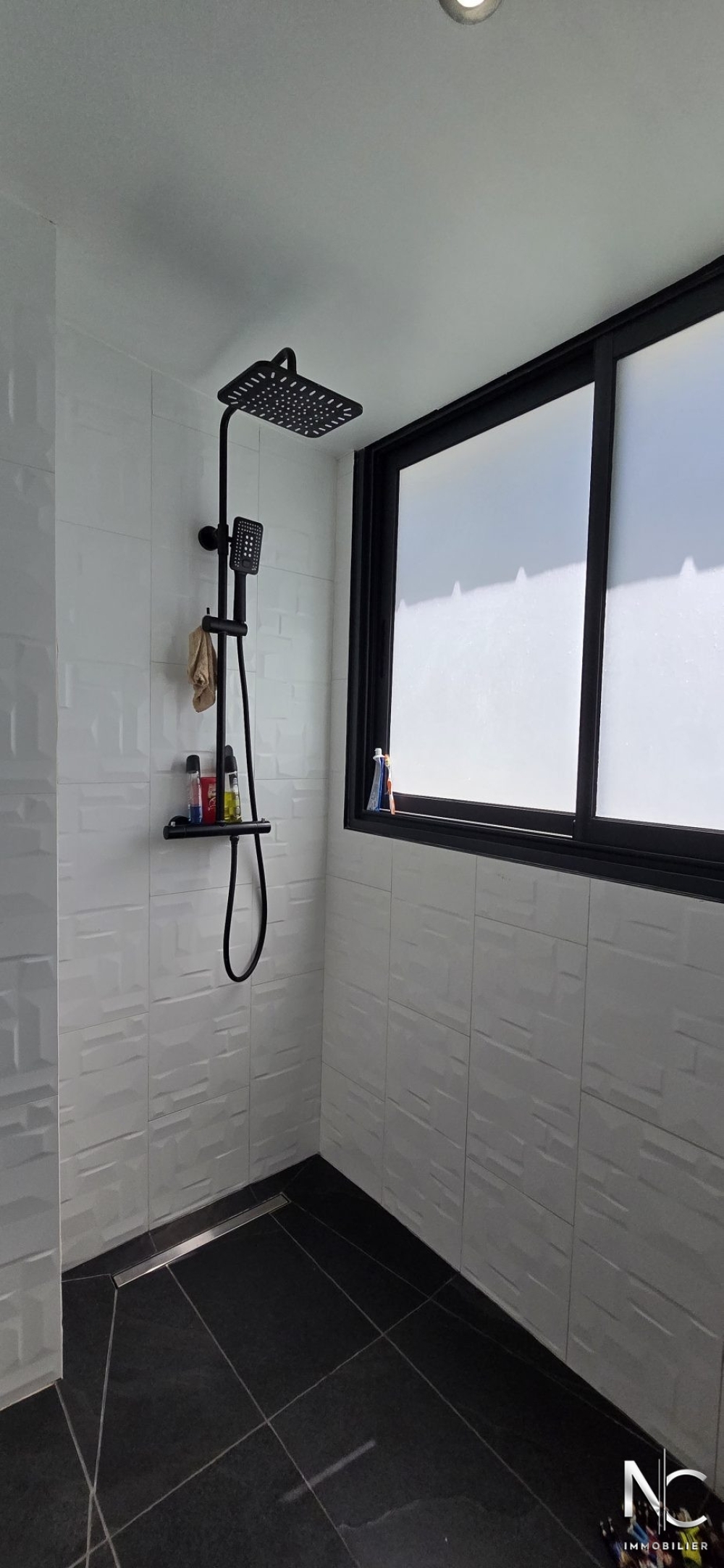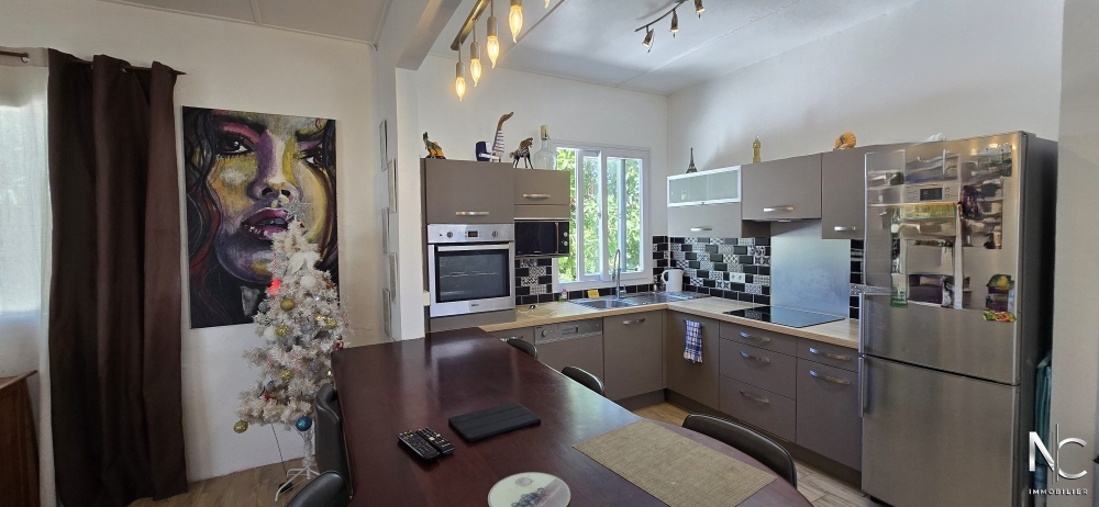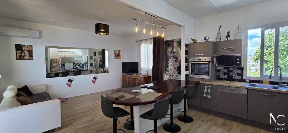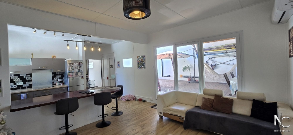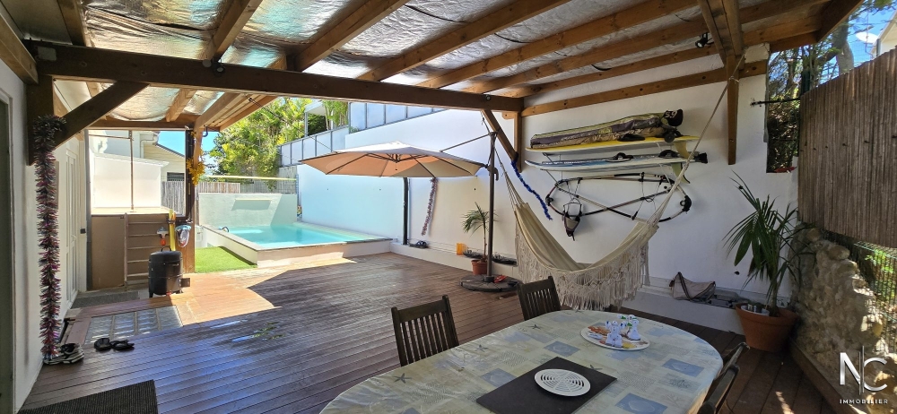 Situé en fond d'impasse, à l'abri des regards, haut de villa F3 offrant : entrée, séjour climatisé ouvert sur cuisine équipée, 2 chambres climatisées, salle d'eau neuve avec wc. Belle hauteur sous plafond de près de 3 mètres. Le deck de 50 m² est entièrement couvert et prolongé par une piscine béton chauffée et fonctionnant au sel. Chauffe-eau solaire.